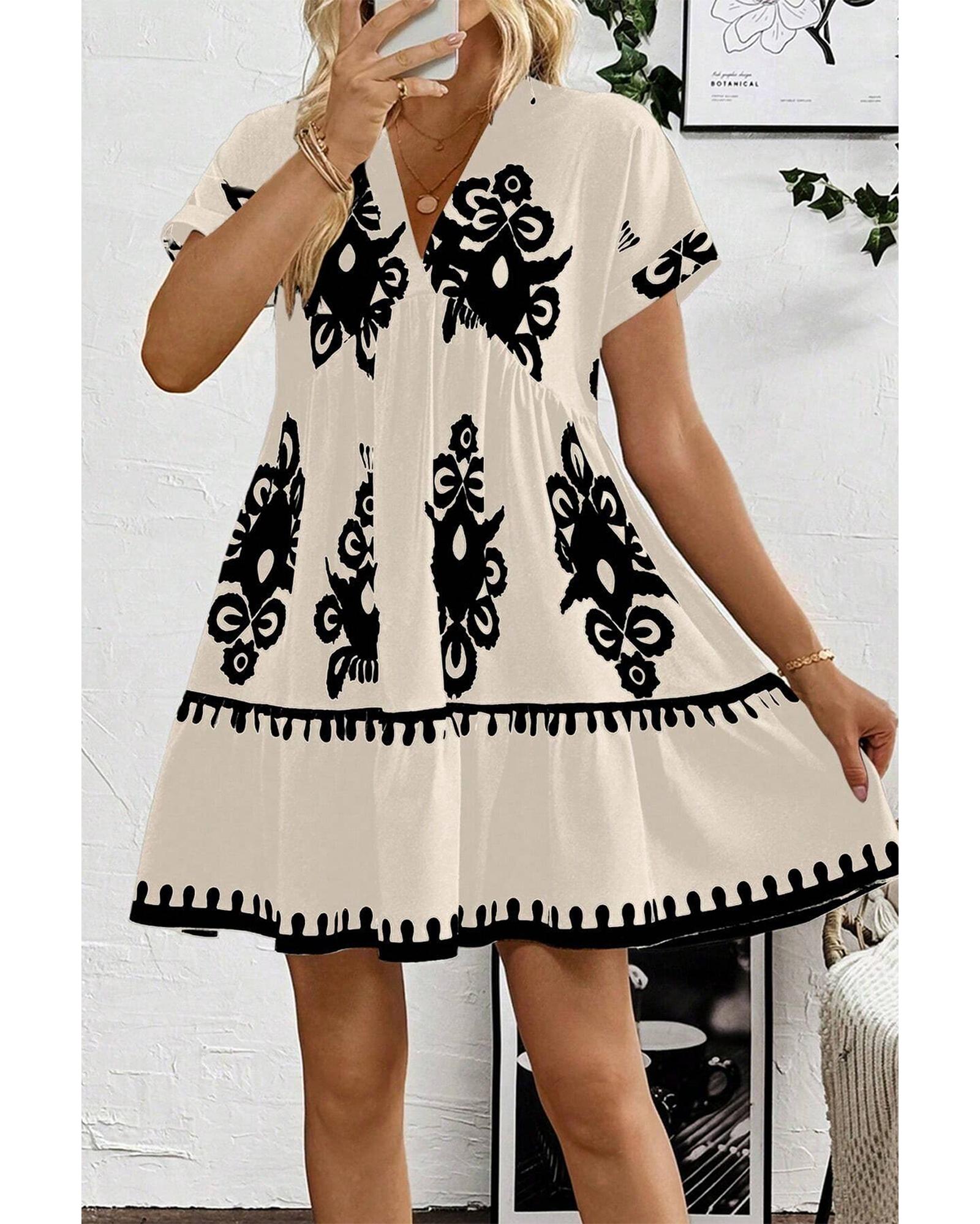 This black vintage print dress features a stylish V neckline and a high waist design that accentuates your curves. The short sleeves make it suitable for various occasions, offering both comfort and versatility.