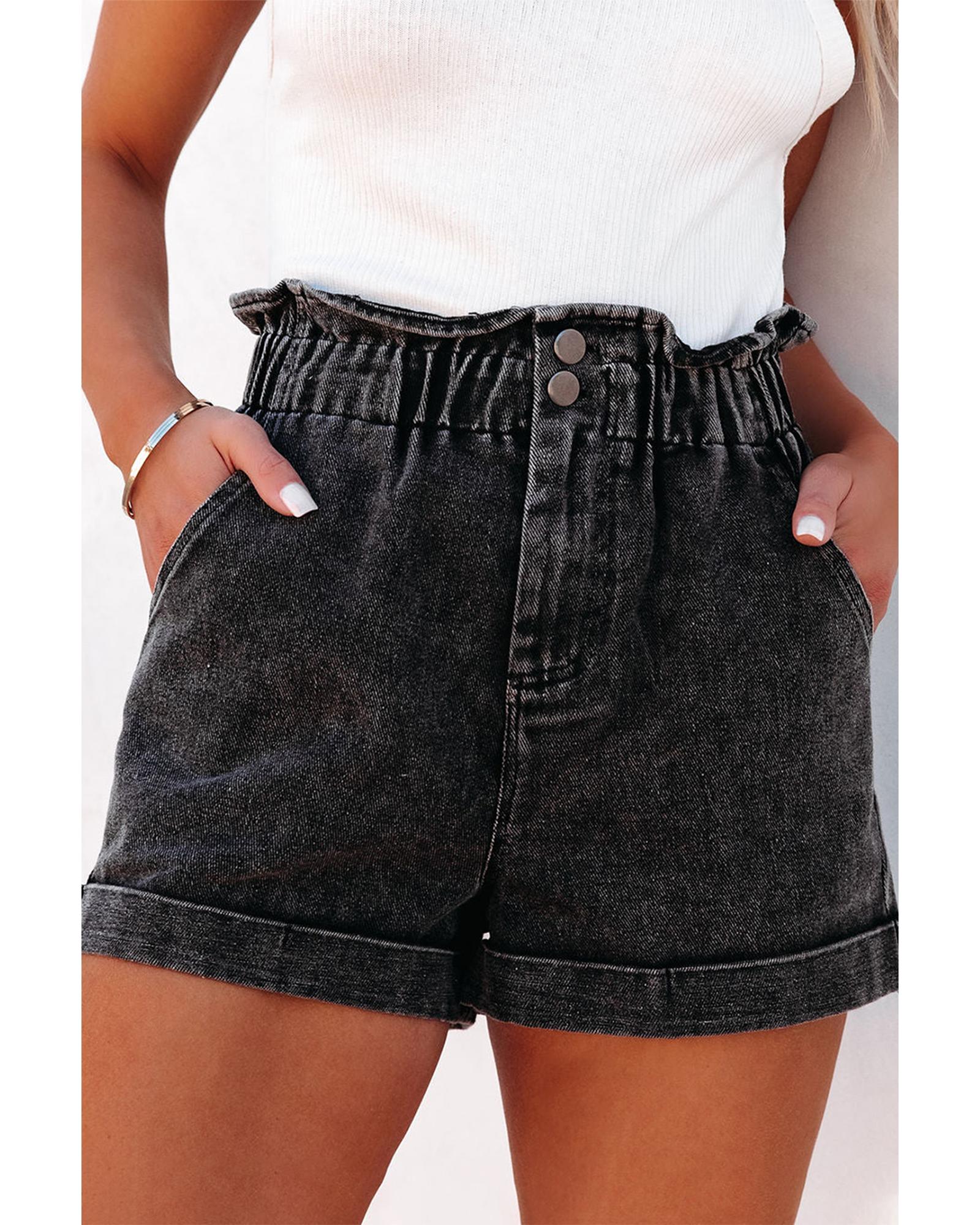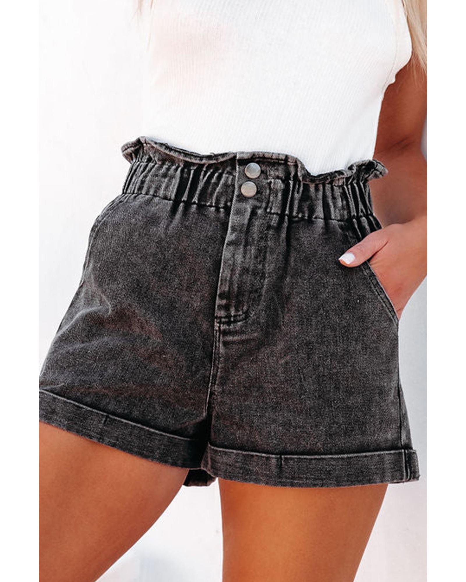 This pair of black vintage washed frilled high waist denim shorts offers a trendy and fashionable look with a vintage touch. Designed with a high waist and paperbag style, it provides a feminine silhouette suitable for women and modern girls of various ages. The mineral wash and fold edge details add unique style elements to the shorts.