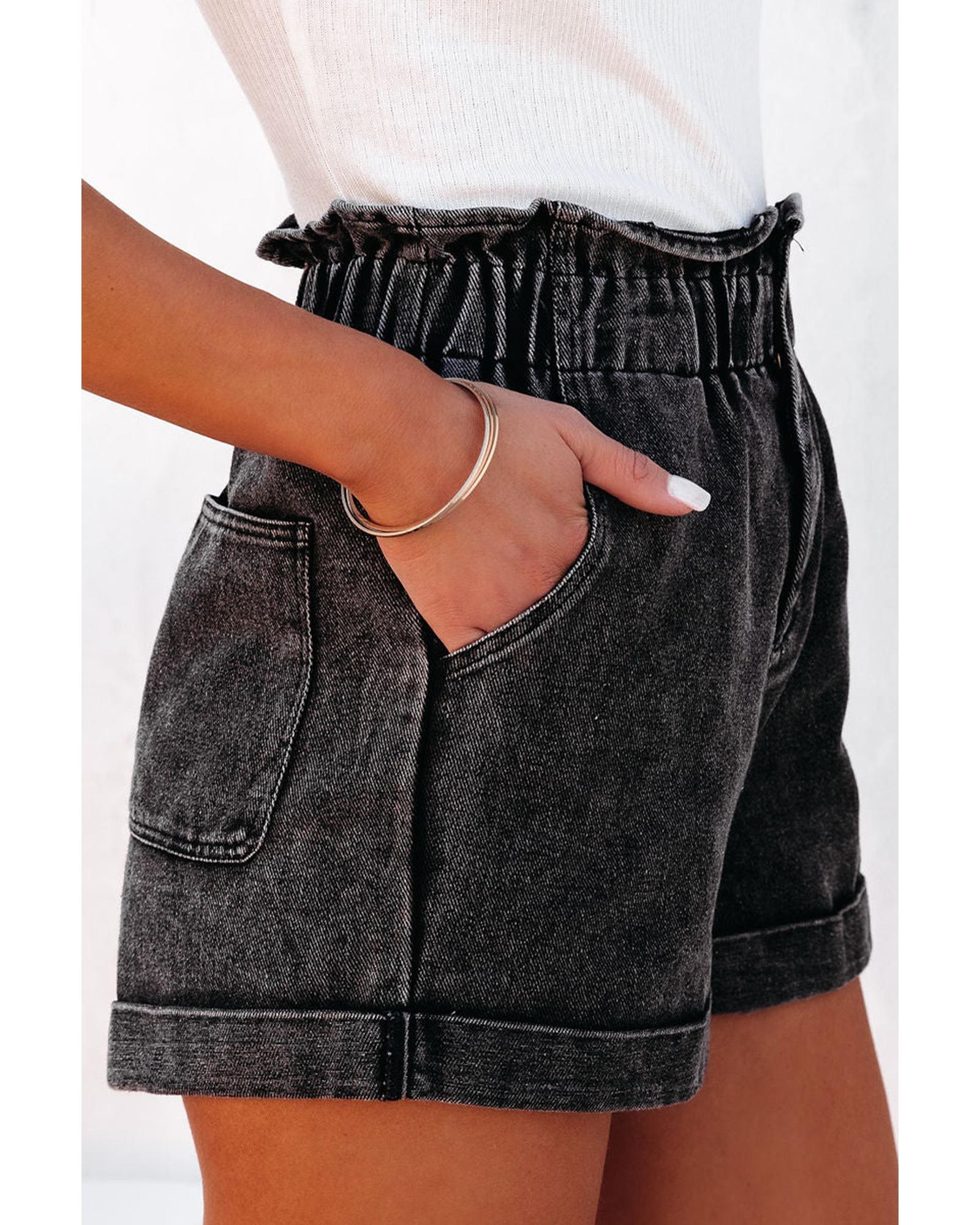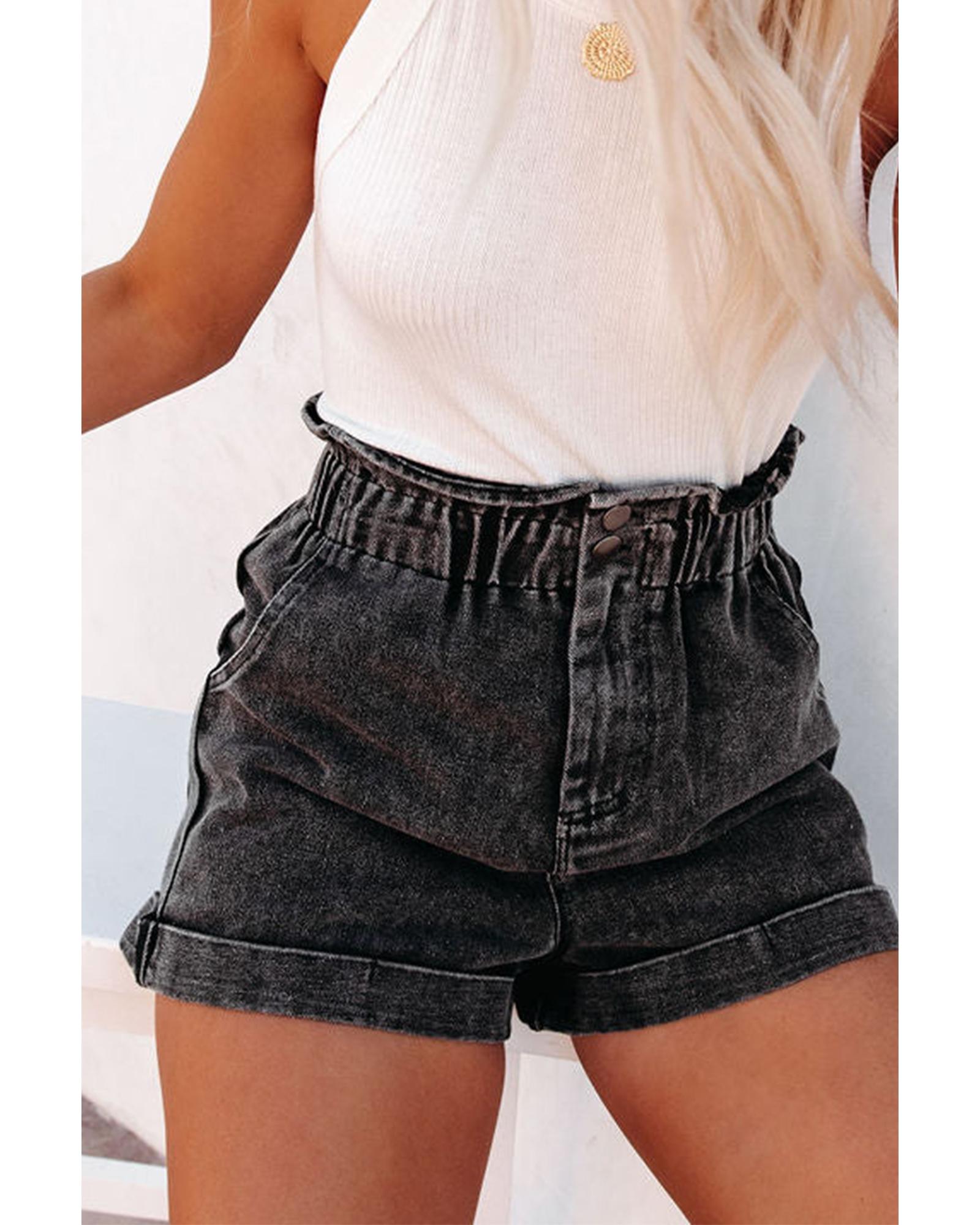 This vintage washed black denim shorts feature a high waist design with a feminine paperbag waist and fold edge details. Crafted for a trendy fitted look, these shorts are suitable for women and modern girls of various ages, offering a fashionable and versatile style.