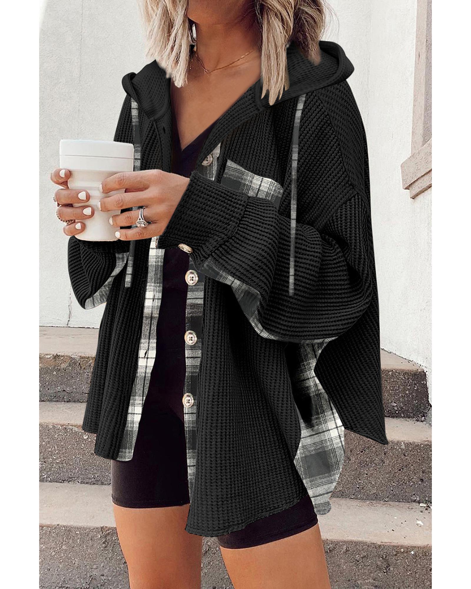 This black waffle knit plaid patchwork shacket features a trendy oversized fit and a practical hood, making it ideal for effortless layering. Crafted from cozy fabric, it combines style and comfort for everyday wear.