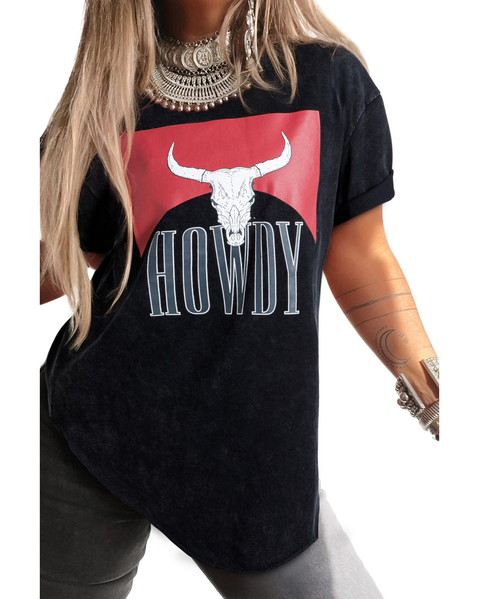 Black Western HOWDY Steer Head Print Side Slits Loose Fit T Shirt – L