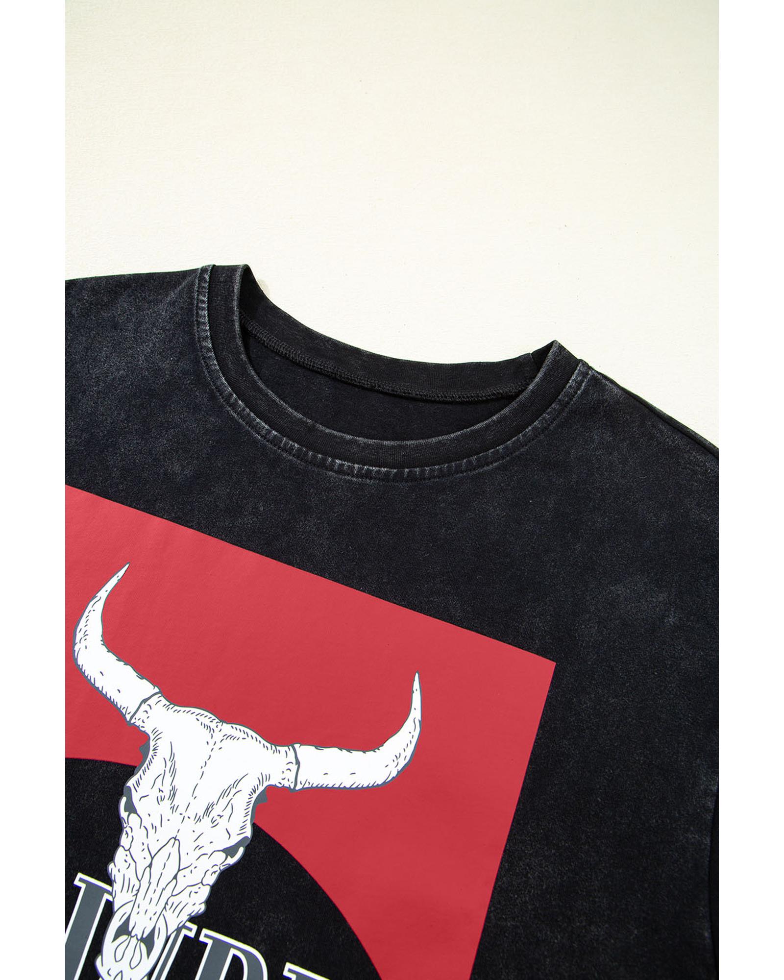 This casual T-shirt features a Western-inspired design with a steer head print and vintage details. It offers a loose fit for comfort and style, making it suitable for everyday wear.