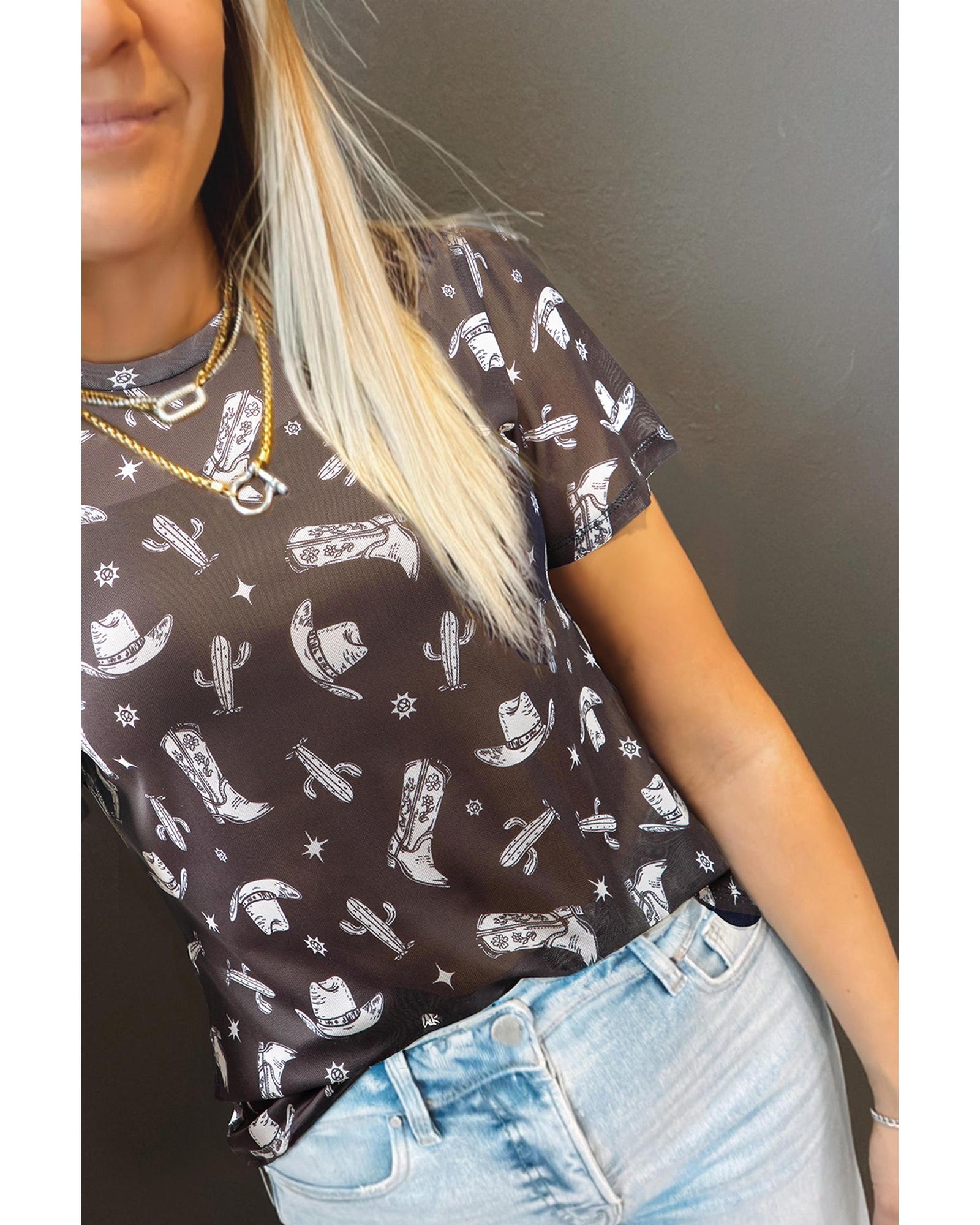 This Black Western Pattern Mesh Sheer Crew Neck T Shirt offers a stylish and unique look with its intricate design and lightweight material. The mesh sheer fabric adds a touch of sophistication, making it suitable for casual and fashionable occasions. The classic crew neck and short sleeves provide a comfortable fit for everyday wear.