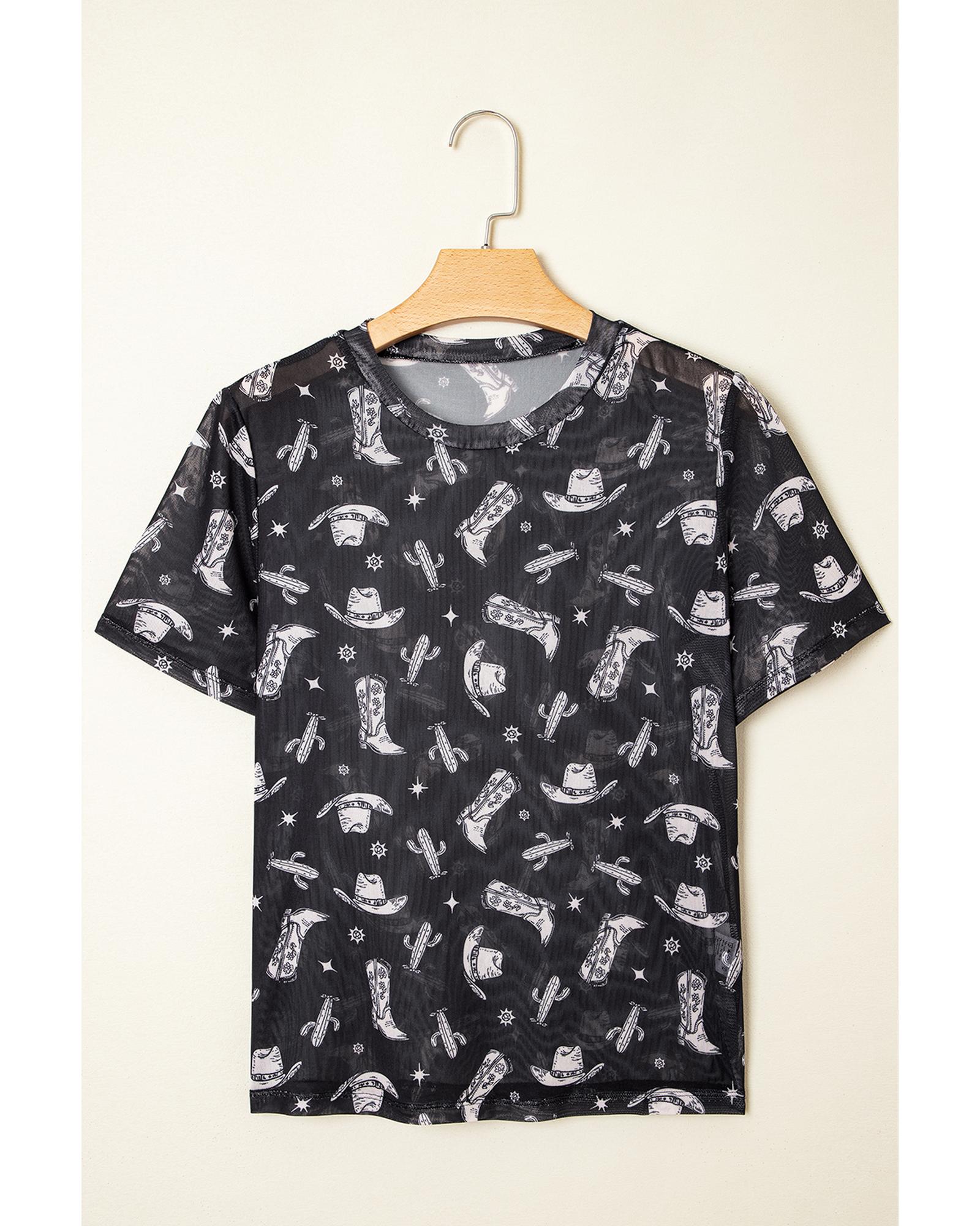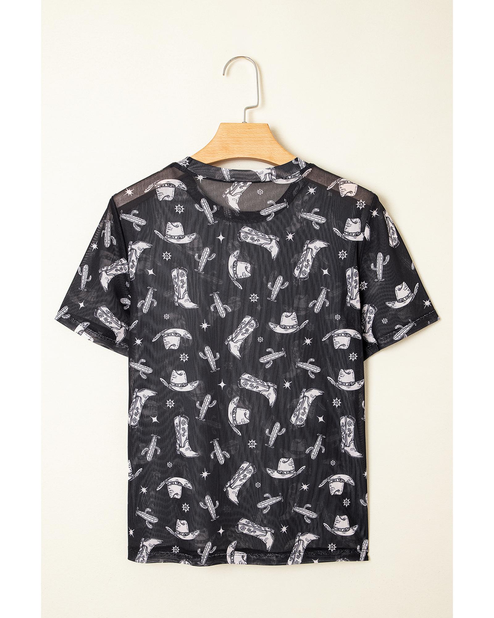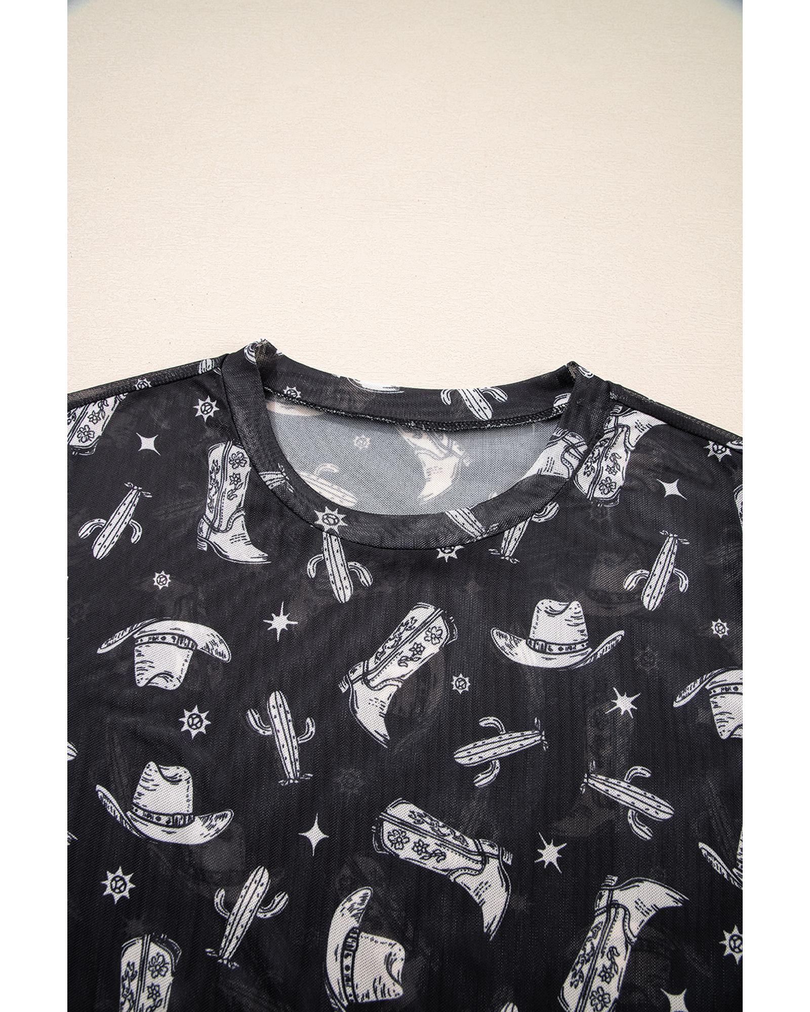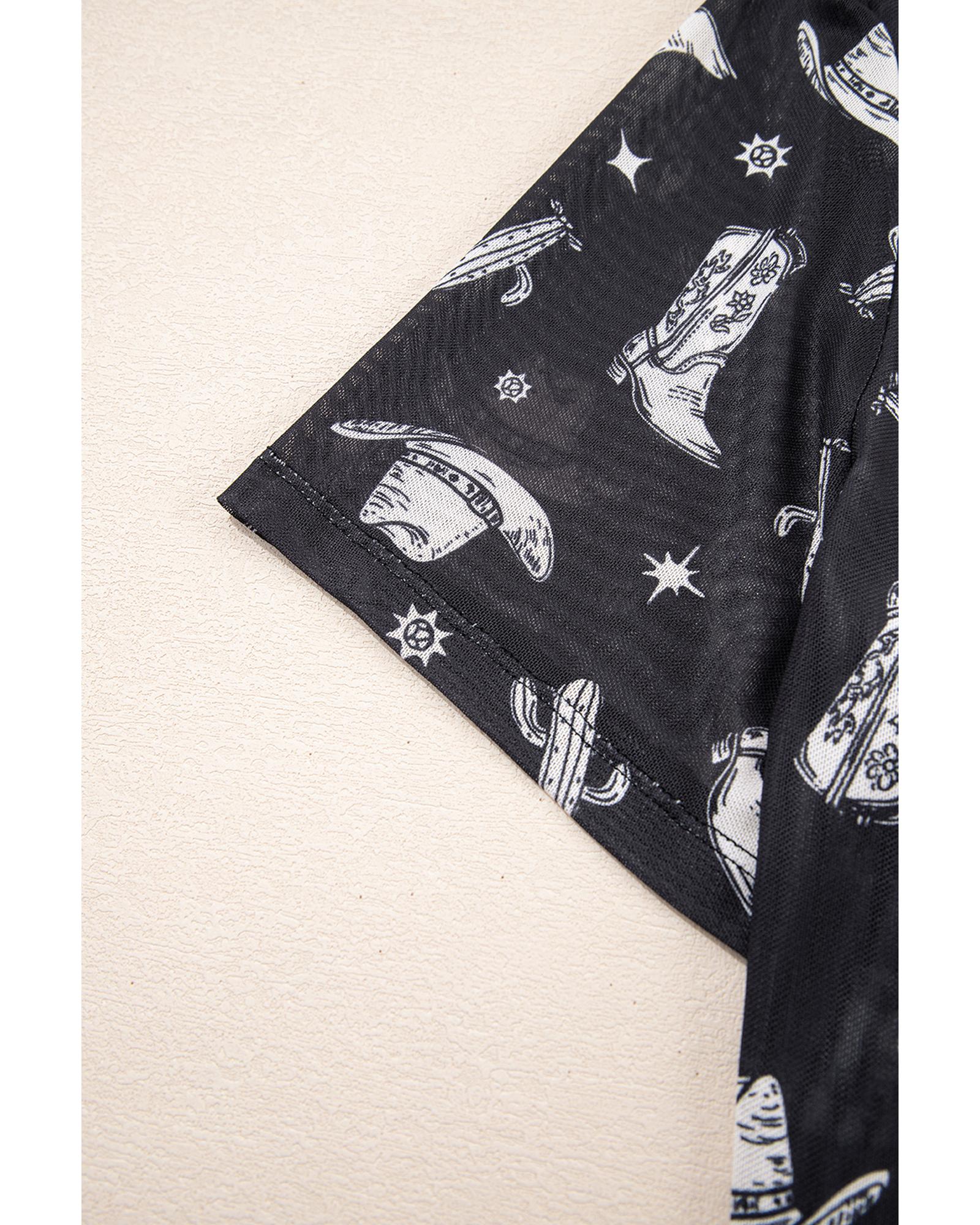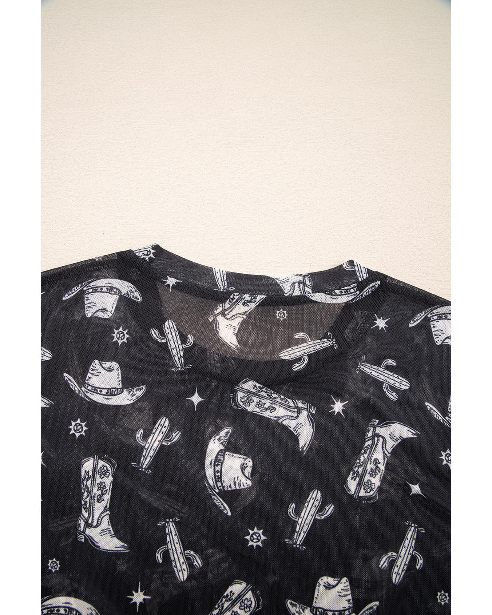 Black Western Pattern Mesh Sheer Crew Neck T Shirt – L