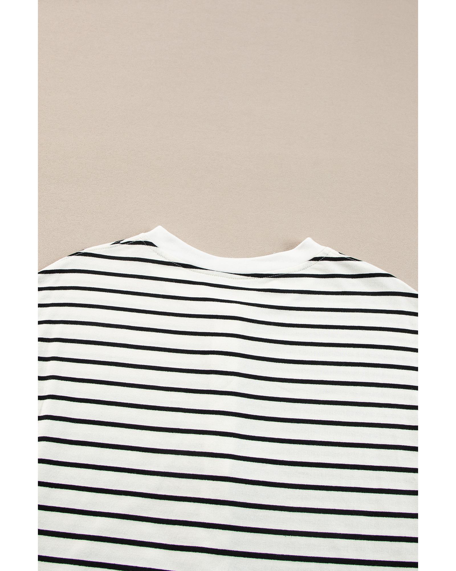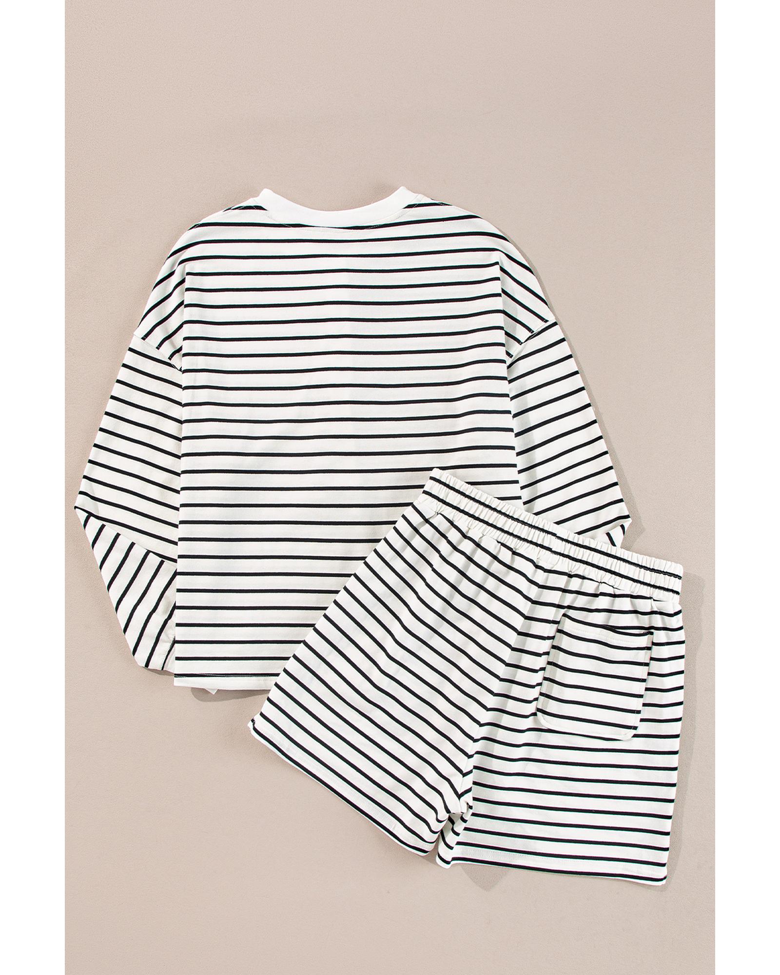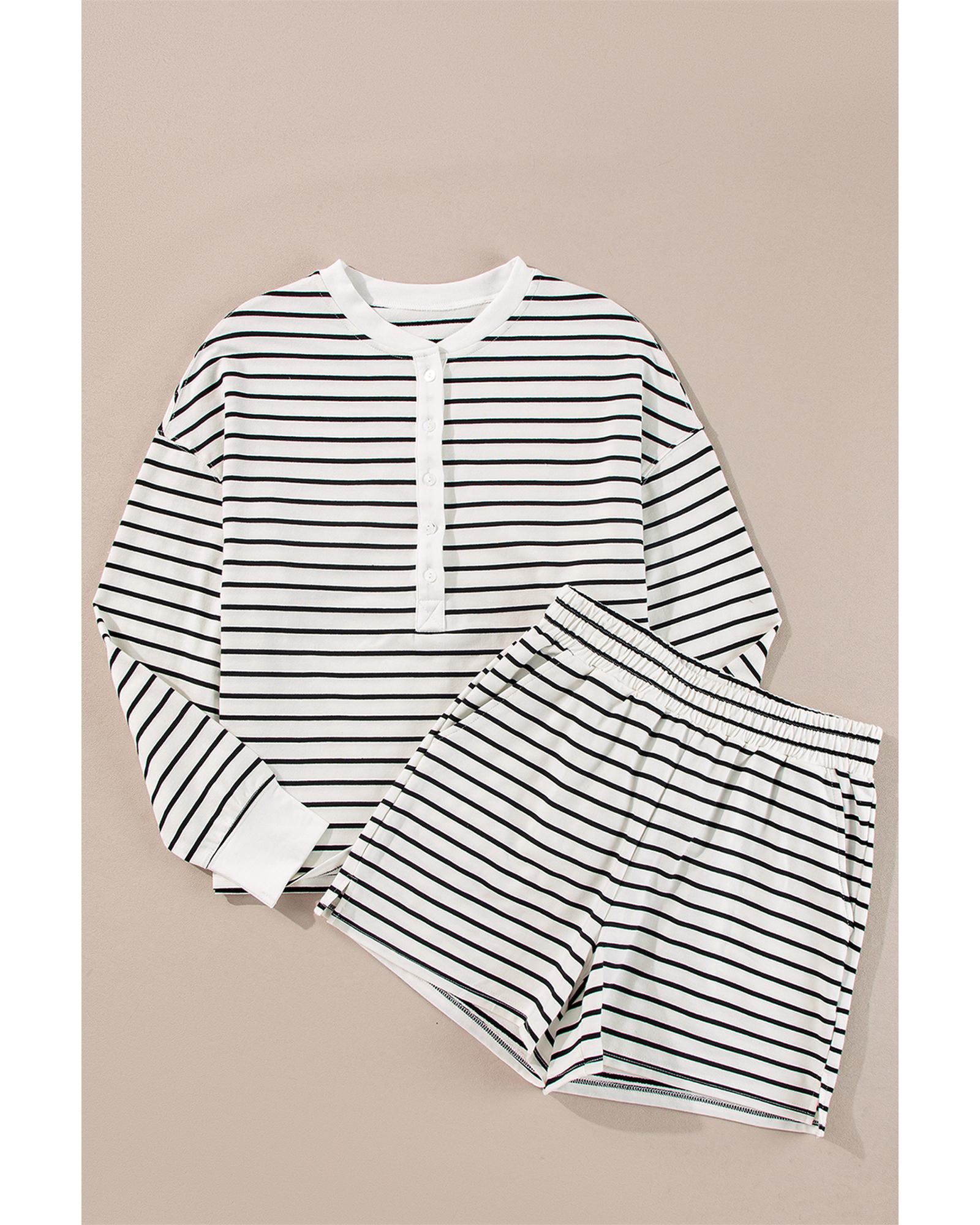 This black and white striped set offers a stylish and comfortable look with a coordinated long sleeve top and shorts. Designed with a trendy fitted style, it is suitable for casual wear and relaxed occasions. The set features a classic stripe pattern, a half button detail on the top, and practical shorts with an elastic waistband and side pockets.