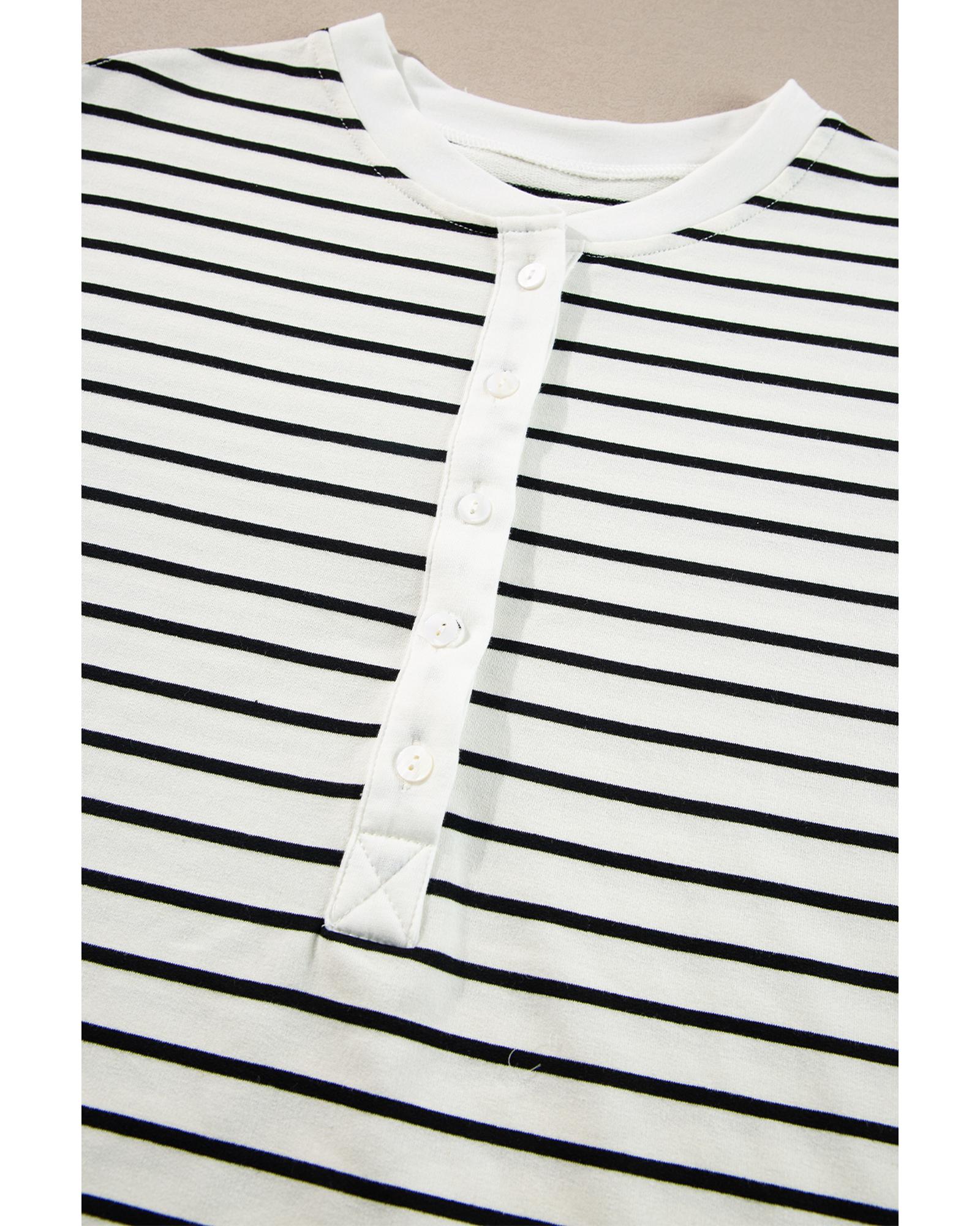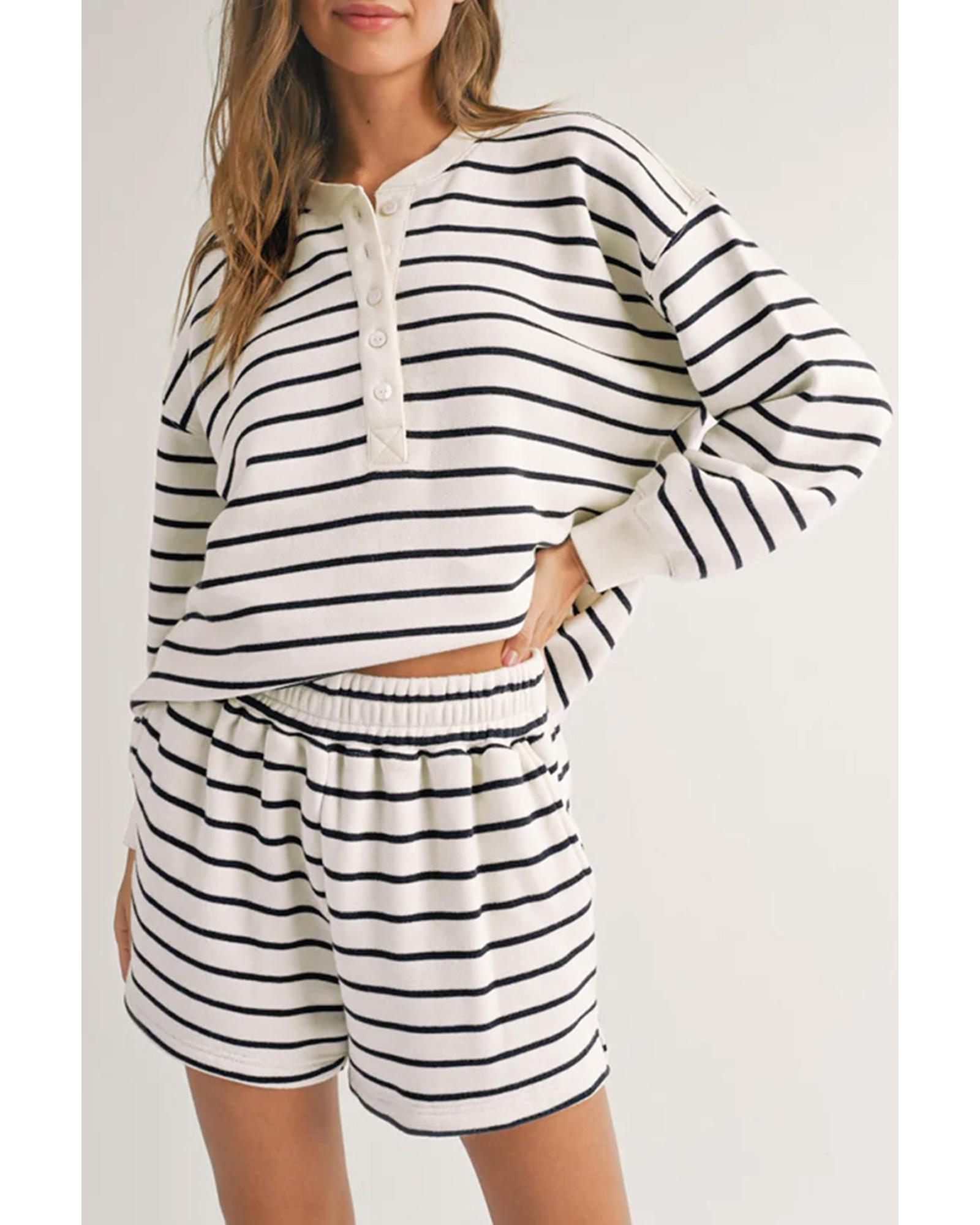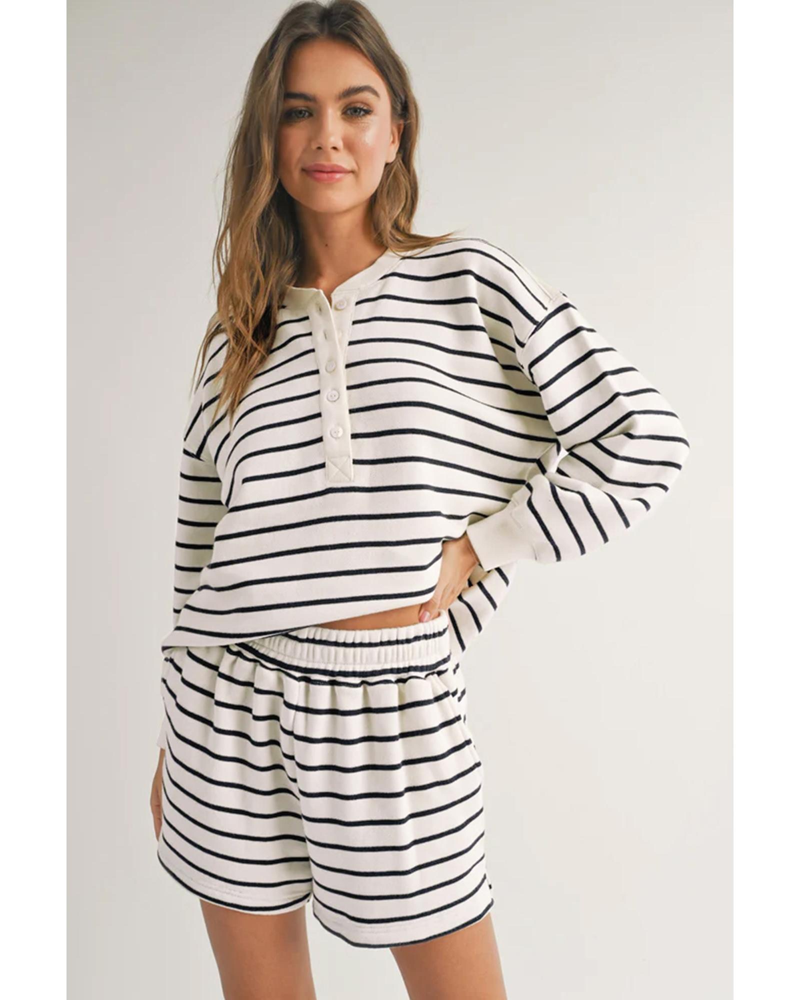 This black and white striped set offers a stylish and comfortable look with a coordinated long sleeve top and shorts. Designed with a trendy fitted style, it is suitable for casual wear and relaxed occasions. The set features a classic stripe pattern, a half button detail on the top, and practical shorts with an elastic waistband and side pockets.