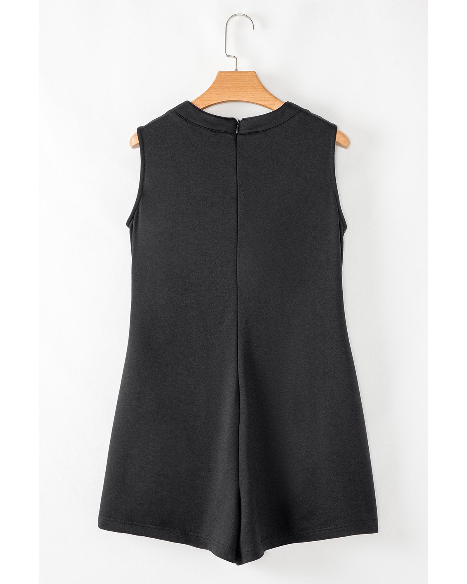 This sleeveless romper features a stylish V-neckline with a tie detail, offering a chic and comfortable look. The design includes flattering pleating that adds texture and movement, making it suitable for various casual occasions. The loose fit ensures all-day comfort, while functional pockets provide convenience for everyday use.