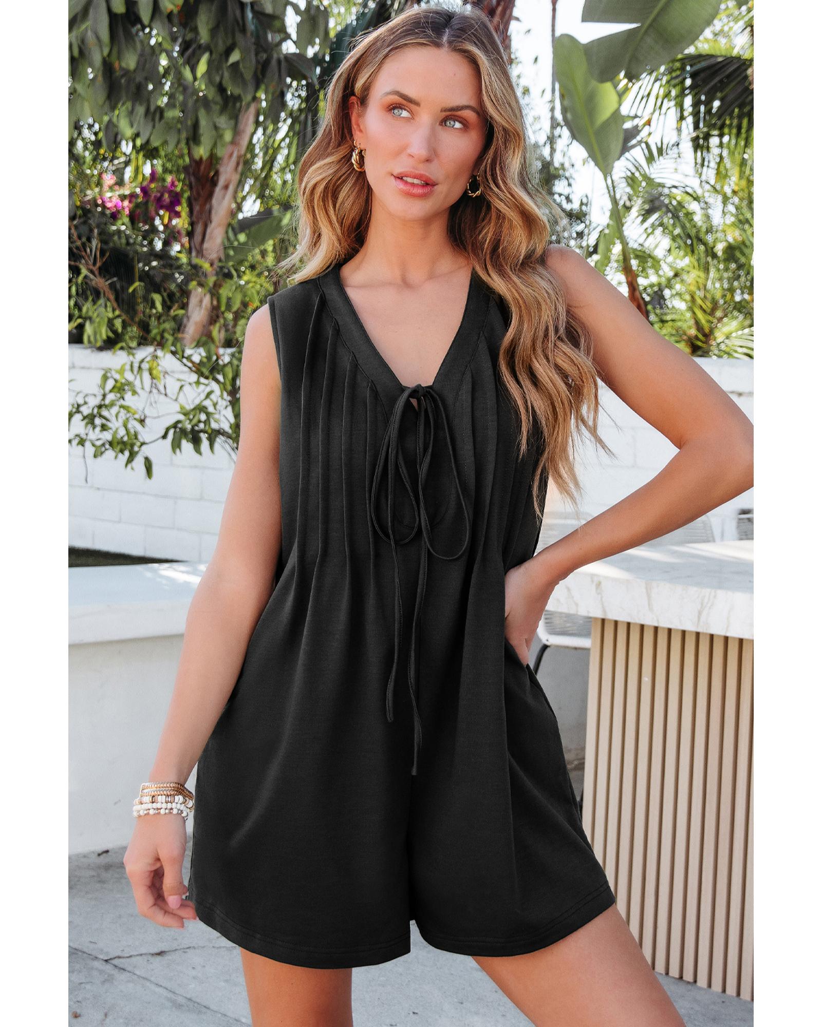 This sleeveless romper features a stylish V neckline with a tie detail, offering a chic and comfortable look. The design includes flattering pleating that adds texture and movement, along with functional pockets for convenience. Its loose fit ensures all-day comfort, making it suitable for various casual occasions.