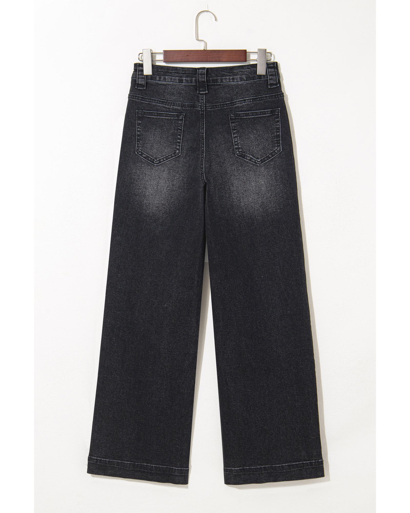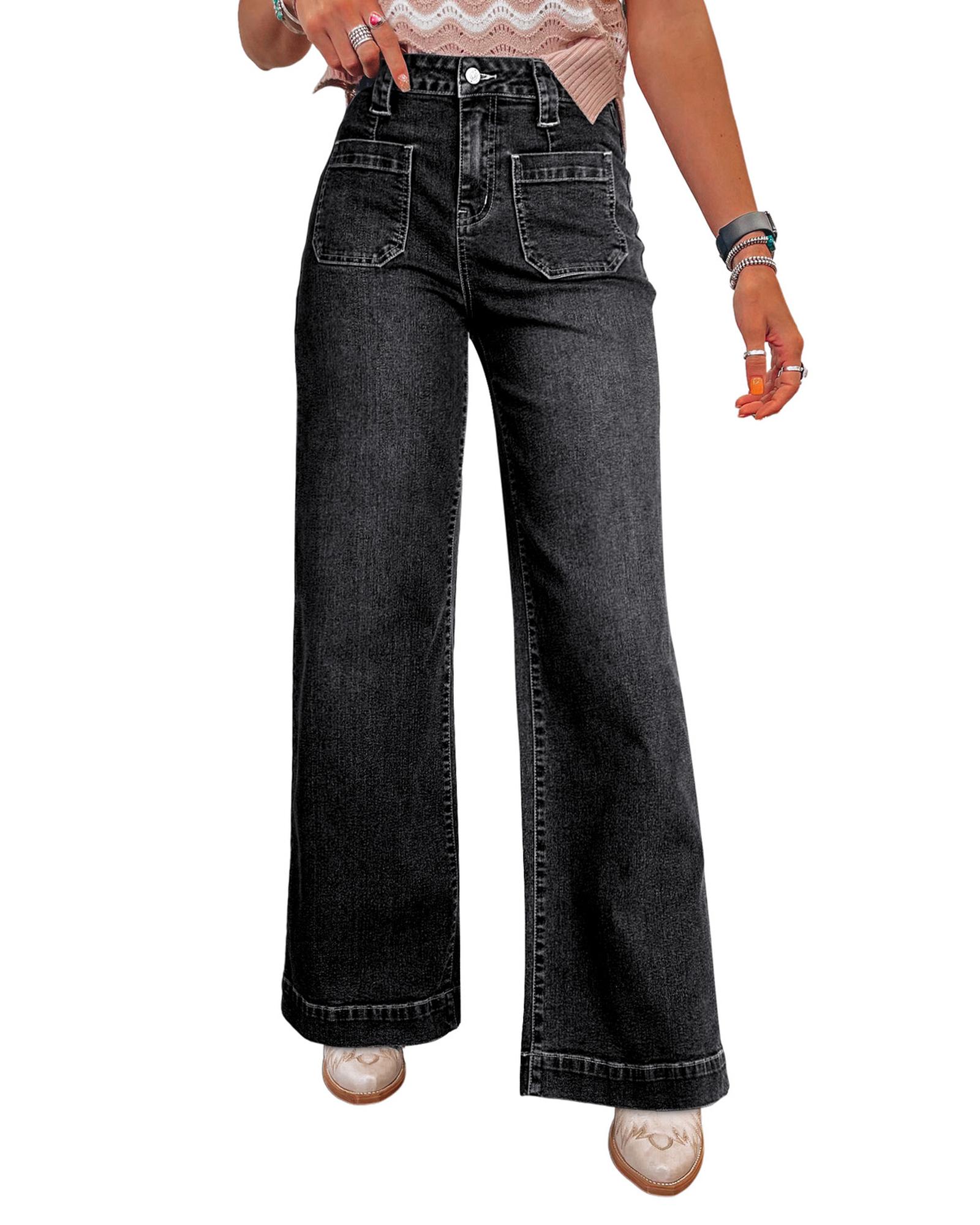 These wide-leg pocketed high waist jeans offer a comfortable and relaxed fit with a stylish design. The high waist accentuates the waistline and elongates the legs, making them a versatile addition to any wardrobe. Crafted from durable denim, they are suitable for everyday wear and can be paired with various tops for different looks.