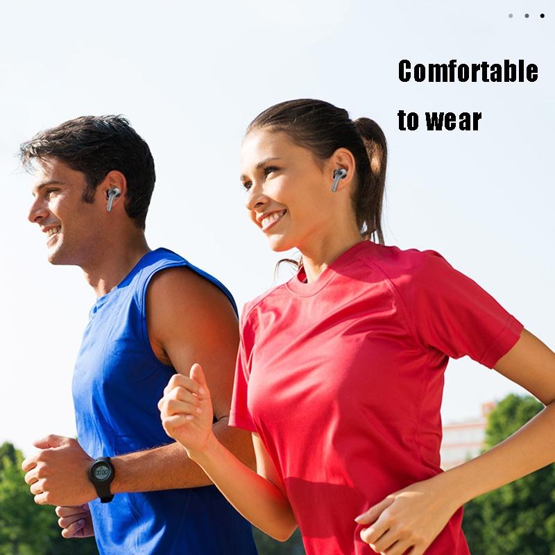 This wireless Bluetooth earphone features a touch display and is designed for active use, offering a comfortable fit and high-quality sound. It provides immersive stereo sound with surround playback and real-time battery level monitoring for both the earphones and charging case.