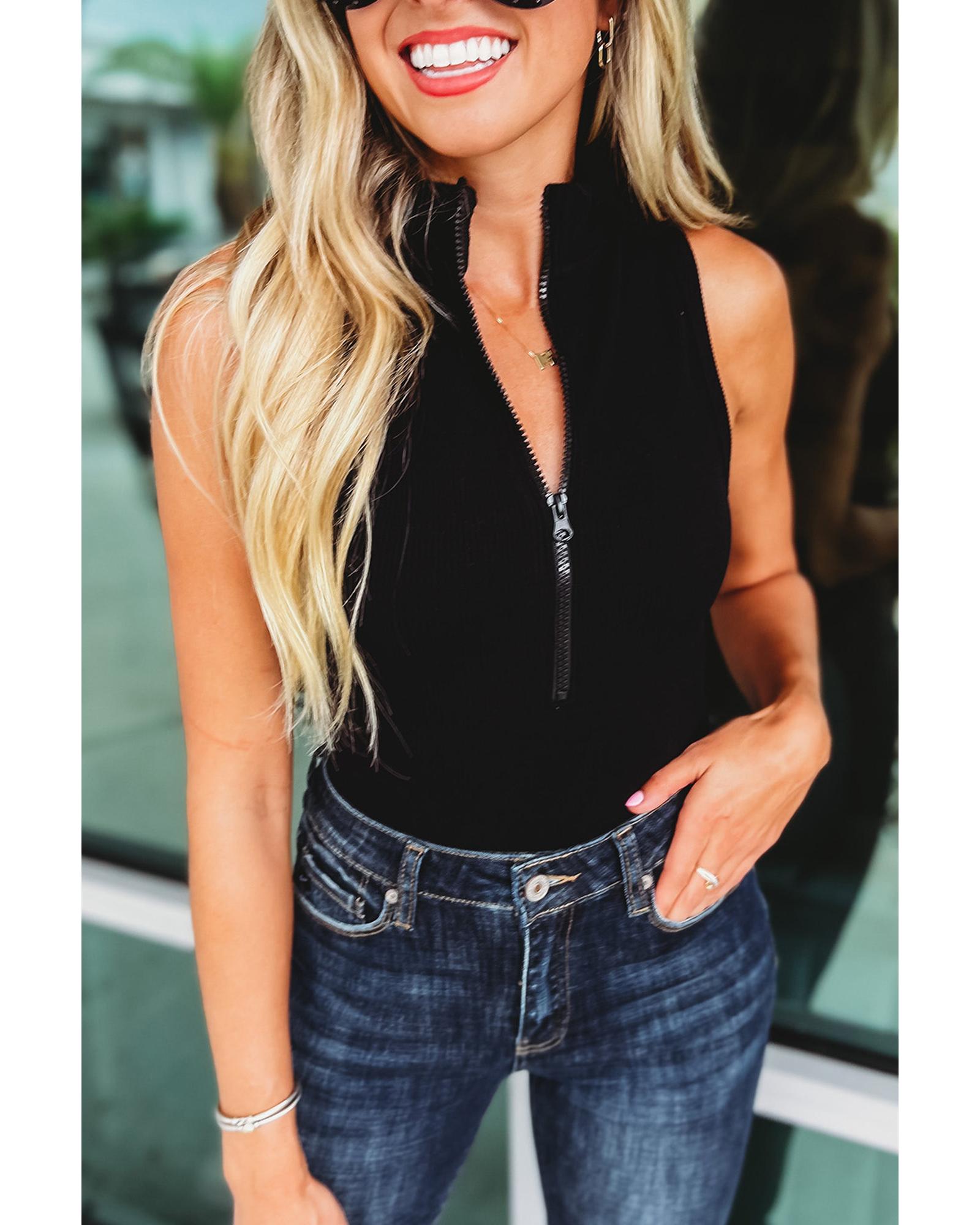 This sleeveless bodysuit features a sleek black zip-up mock neck design with a ribbed texture that adds visual interest and a flattering fit. Its hugging silhouette offers a modern and sophisticated look, making it a versatile piece for layering and styling. Crafted with high elasticity, it ensures a comfortable and snug fit for various body types.