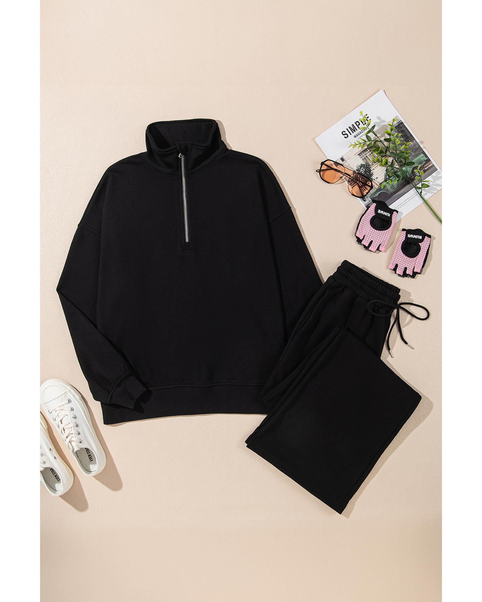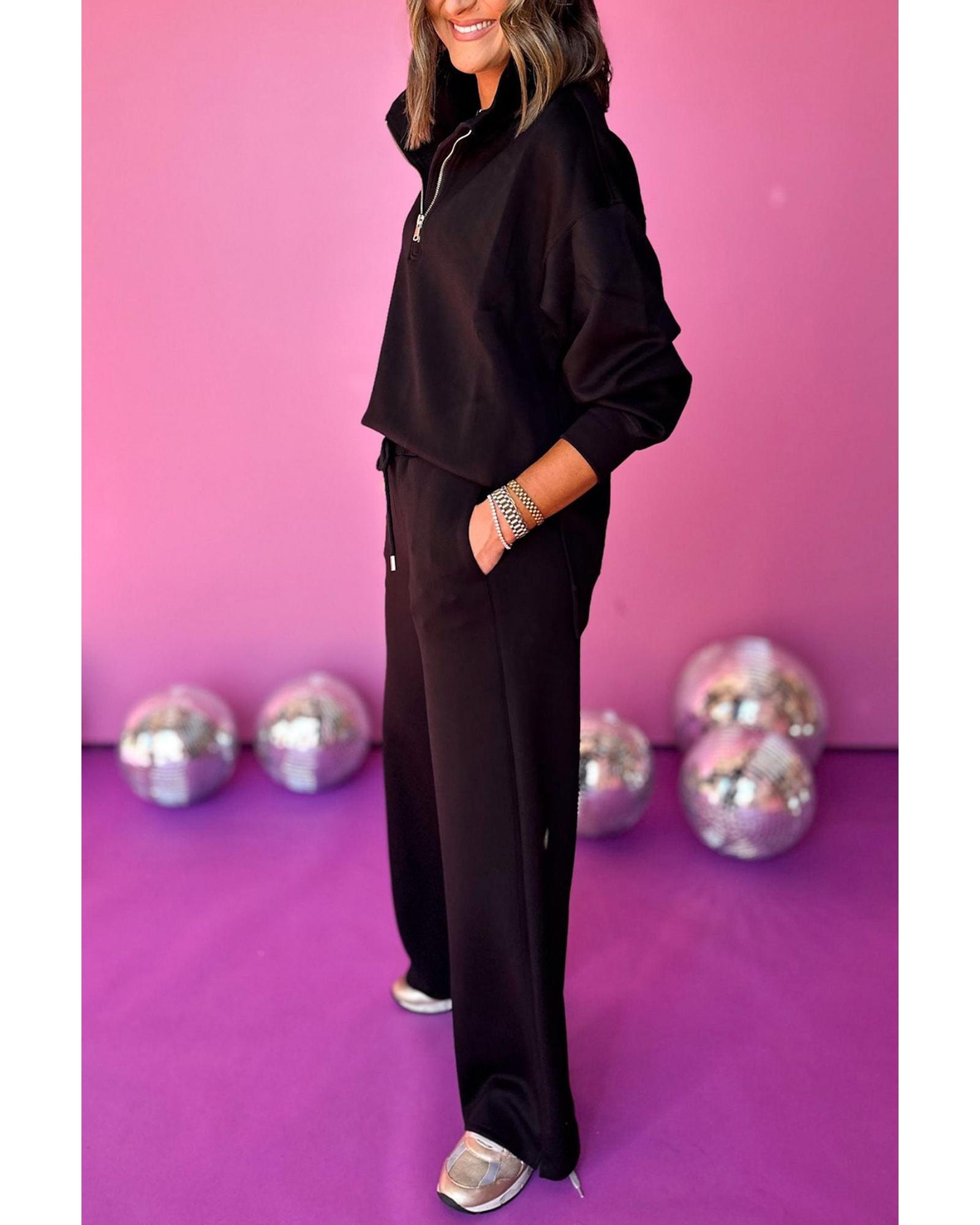 This stylish set features a black zipper stand neck top paired with wide-leg pants, offering a trendy and comfortable look suitable for various occasions. Designed with a fitted silhouette, it combines fashion and functionality for everyday wear or casual outings.
