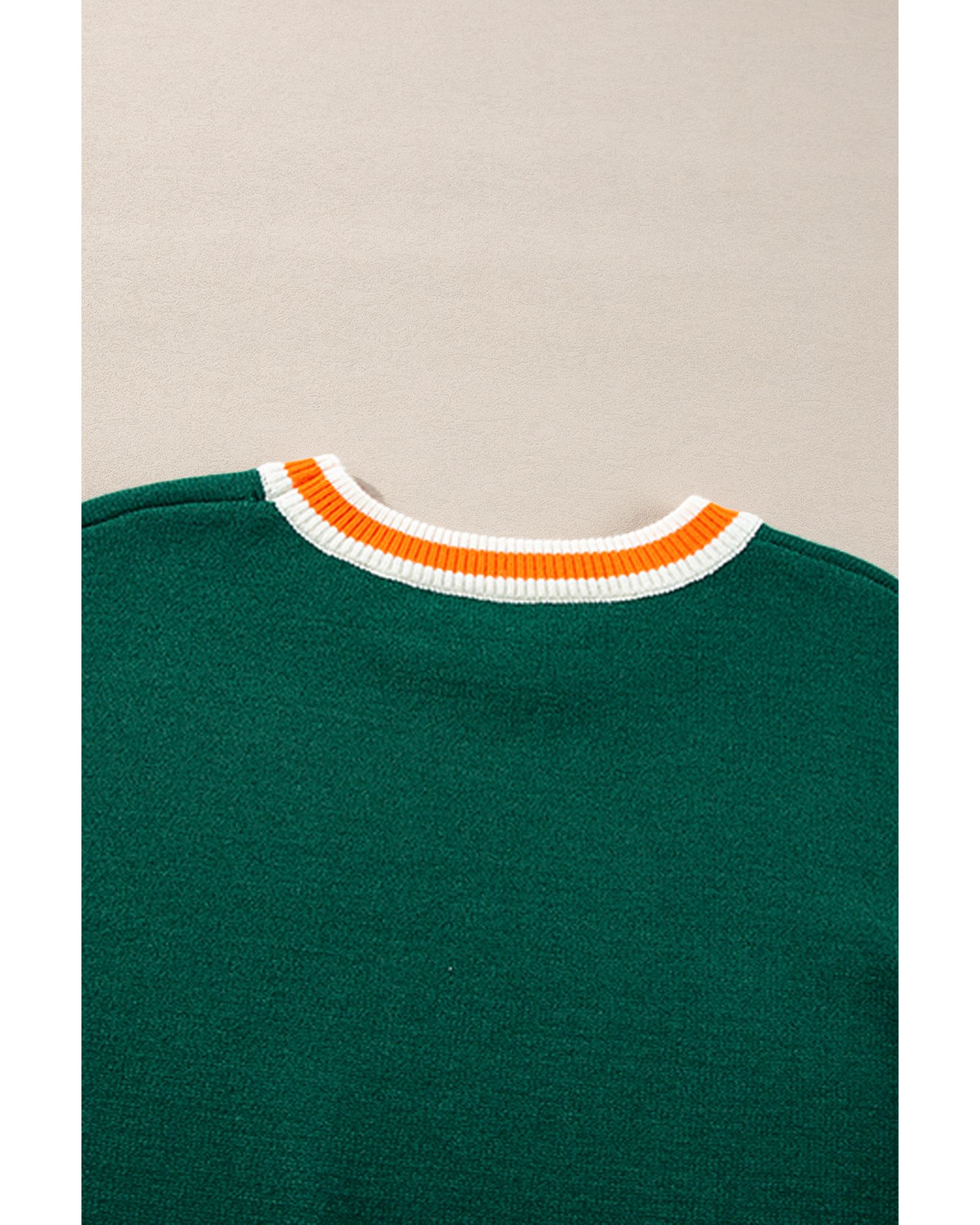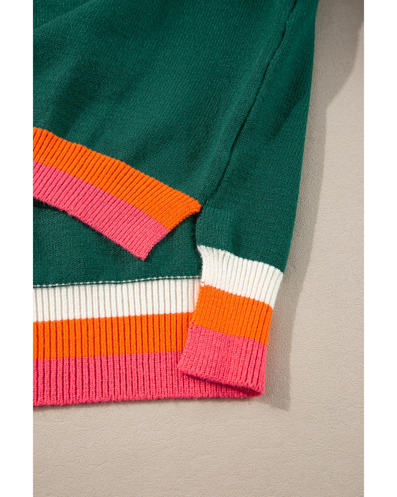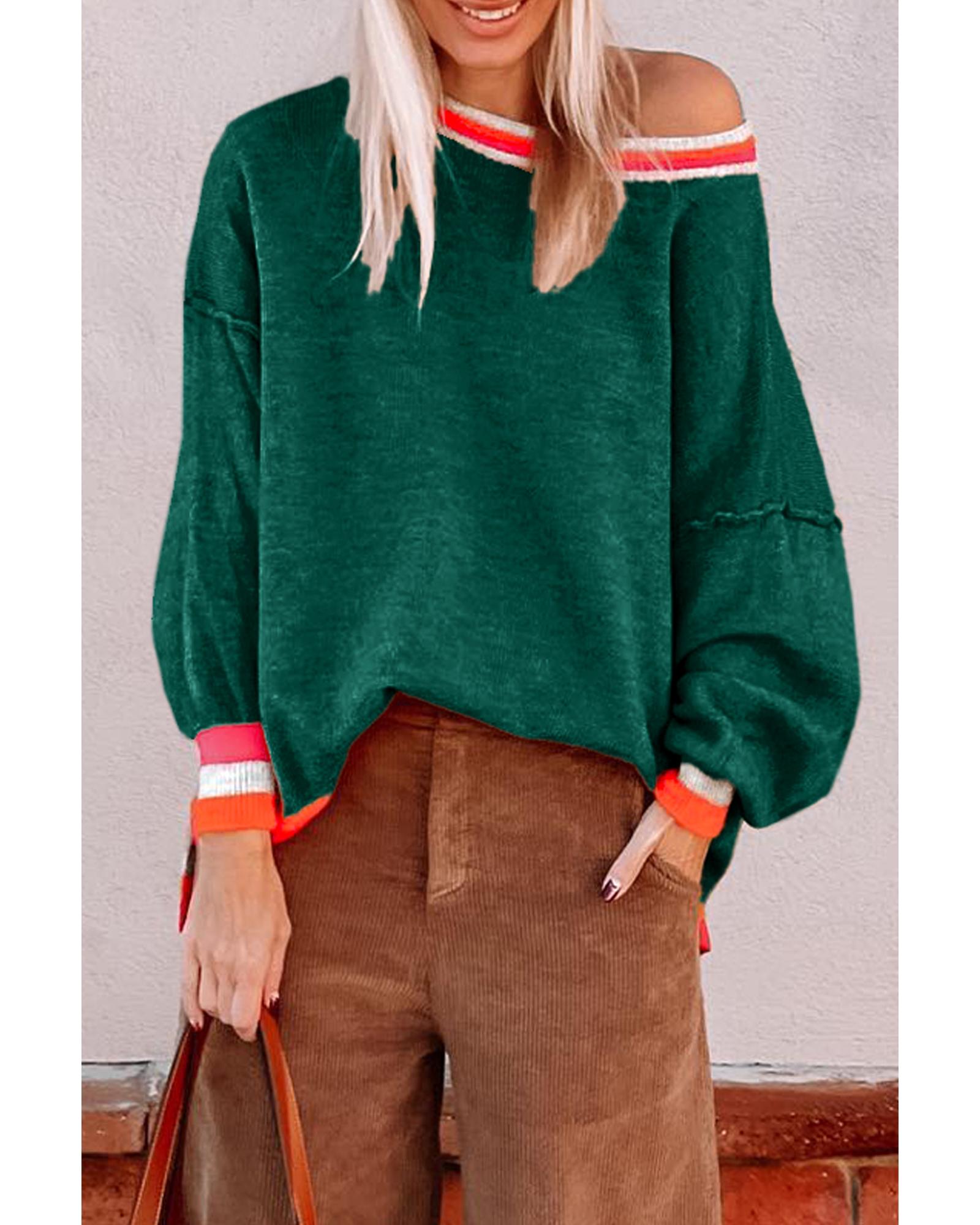 Blackish Green Colorblock Striped Trim Drop Shoulder Sweater – L