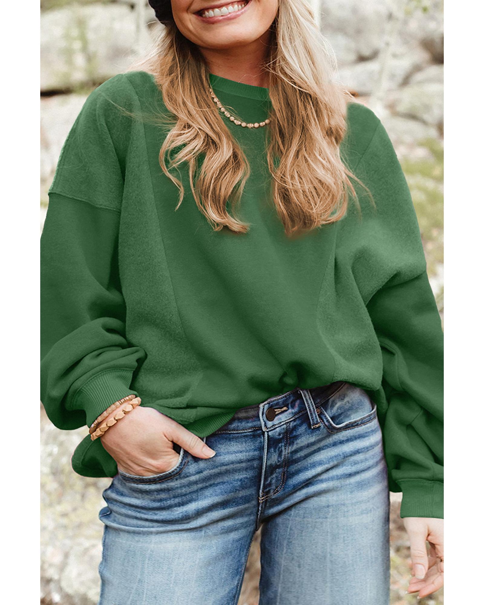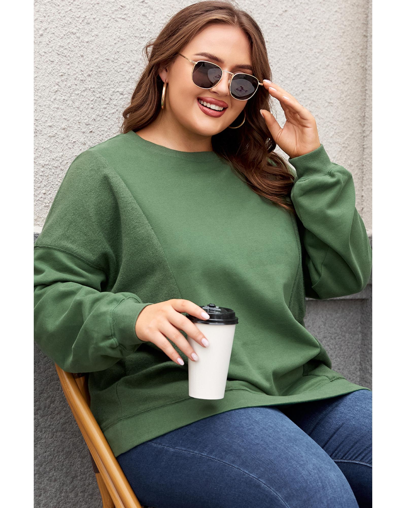 This blackish green plus size sweatshirt features a trendy patchwork design and a classic crewneck, offering a casual and stylish look. Made from soft, warm material, it is ideal for cold weather and provides comfort and fashion in one piece.