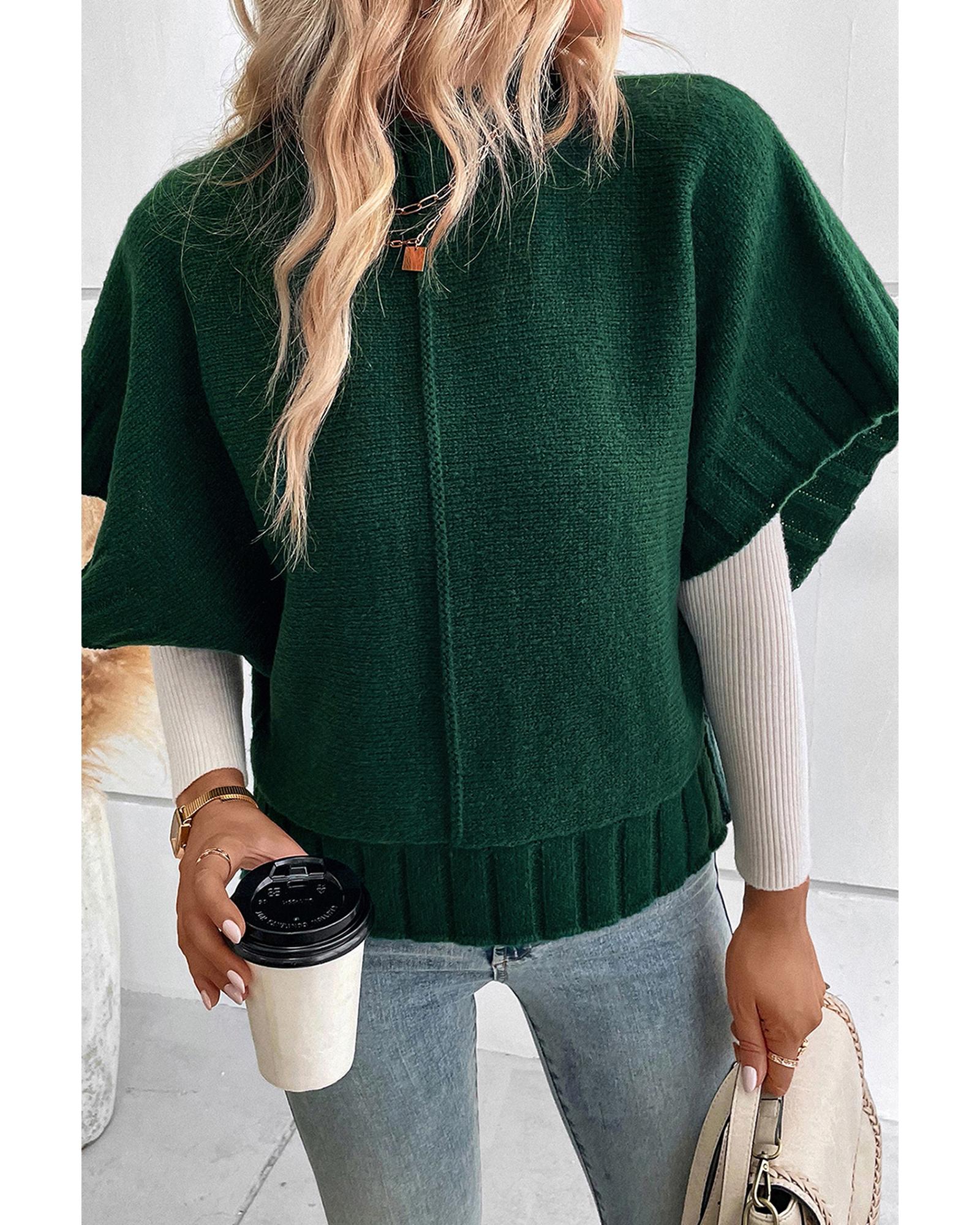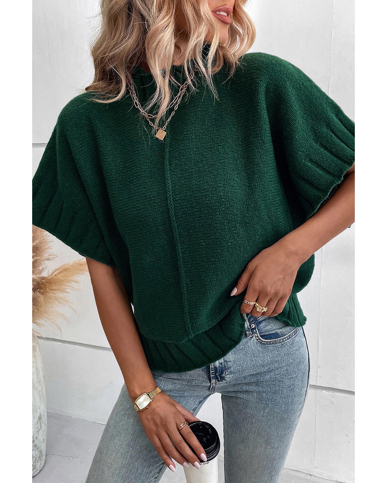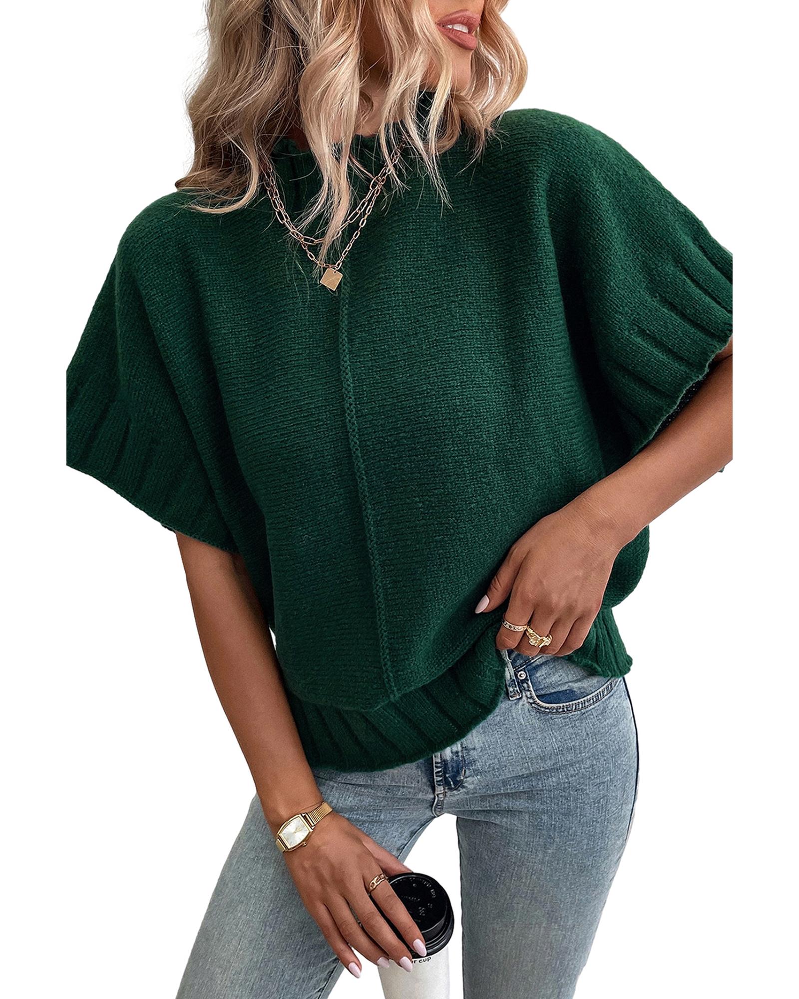 Blackish Green Mock Neck Batwing Short Sleeve Knit Sweater – L