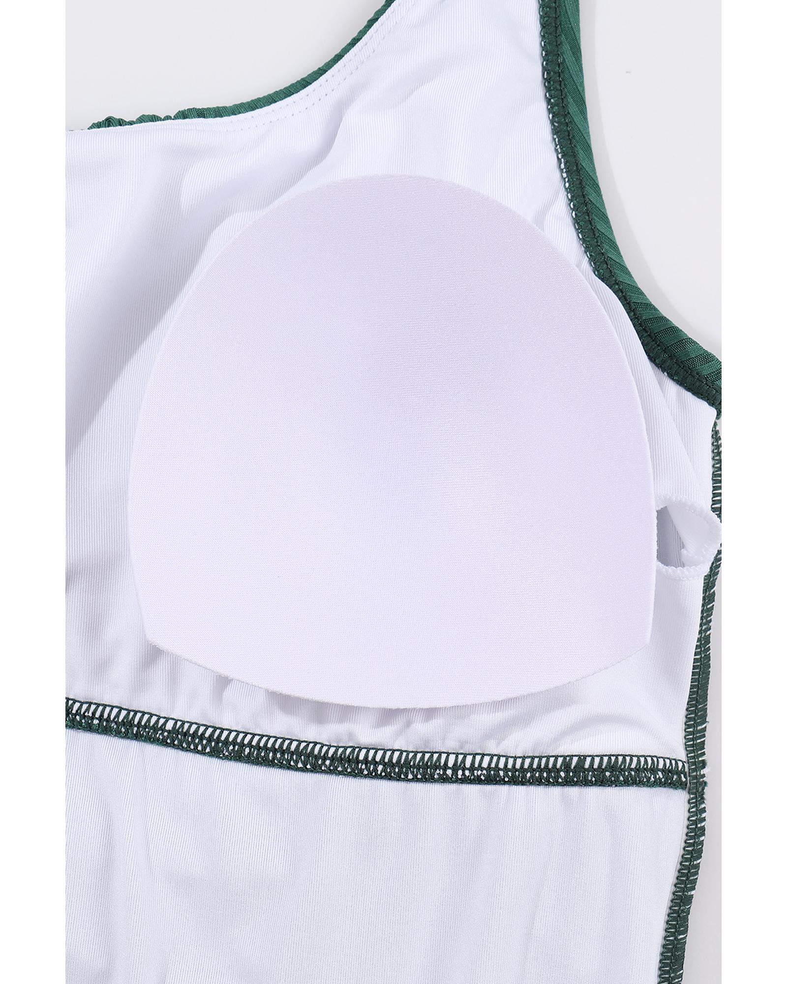 This blackish green ruched U-neck ribbed tankini offers a stylish and sophisticated look, combining fashion and functionality. Designed for women, it features a trendy fitted silhouette that complements various body types. Made with high-quality materials, this tankini is a versatile addition to your swimwear collection.