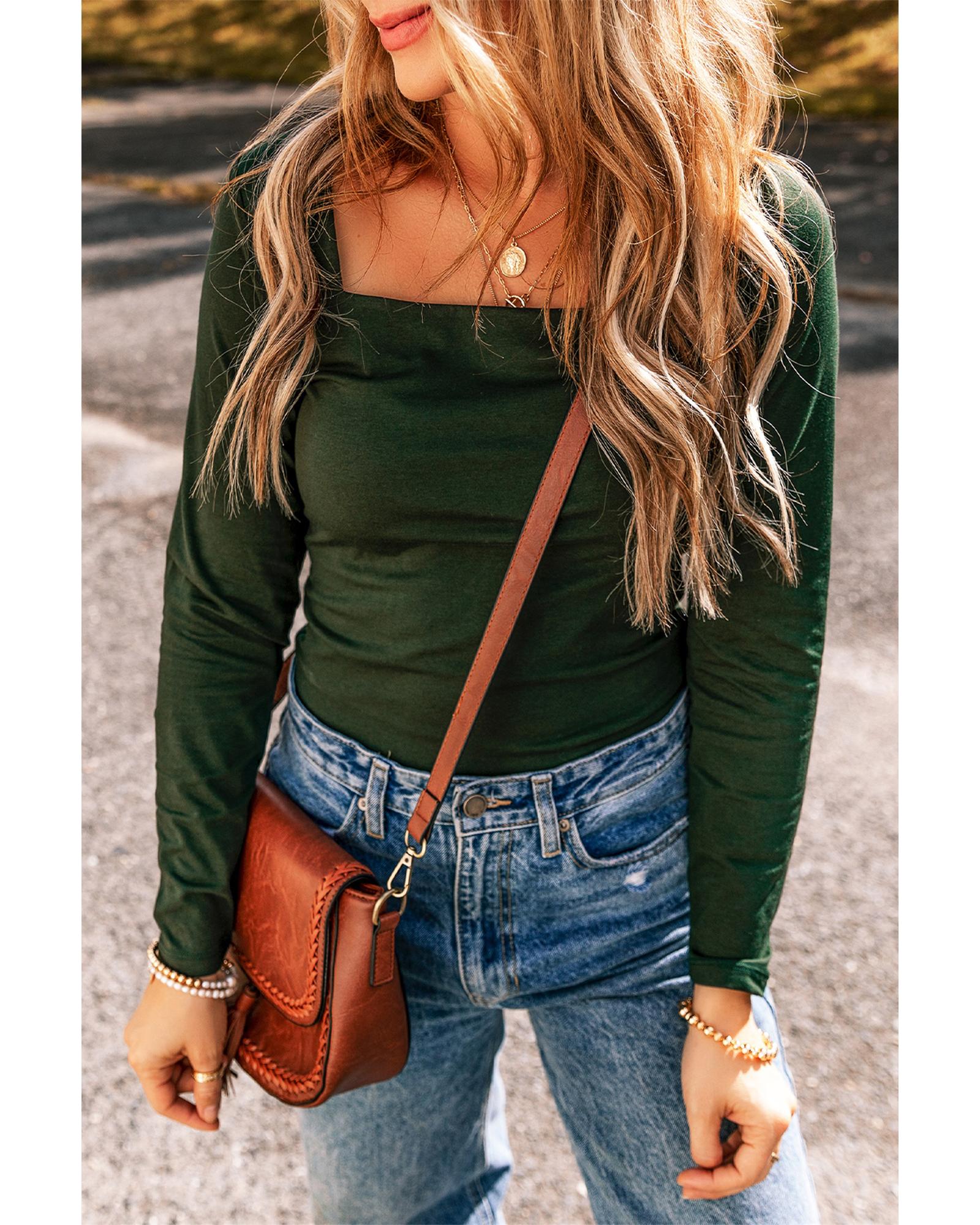 Blackish Green Solid Color Square Neck Long Sleeve Slim Fit Bodysuit – XL