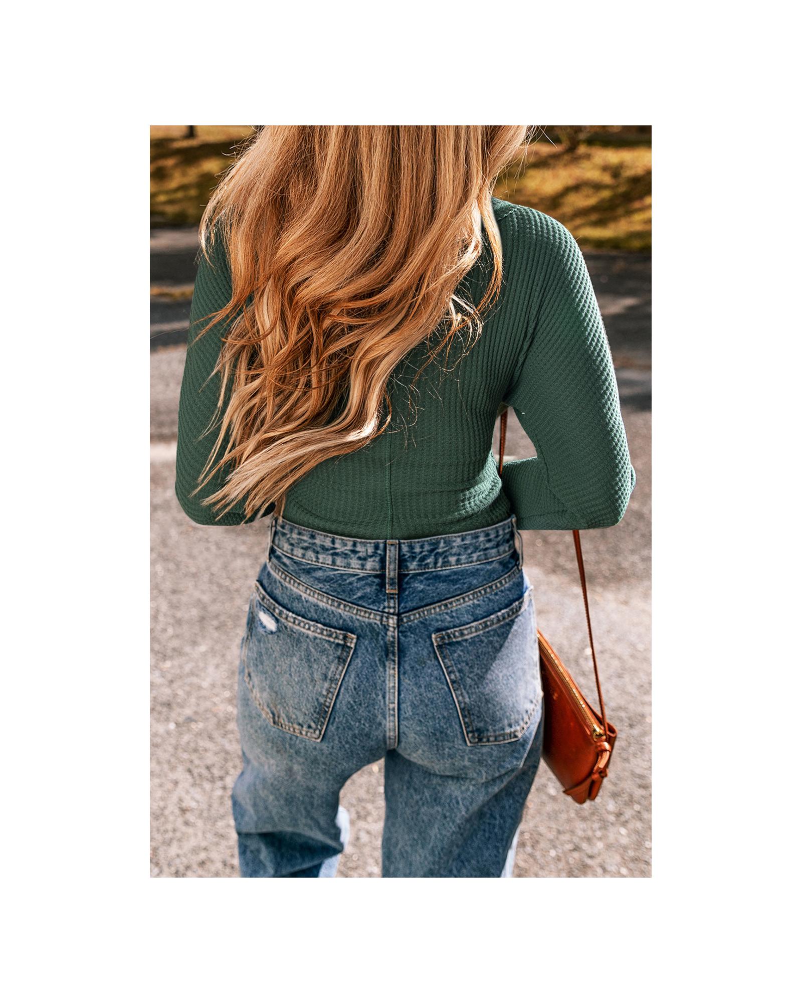 - Waffle knit design in a blackish green color