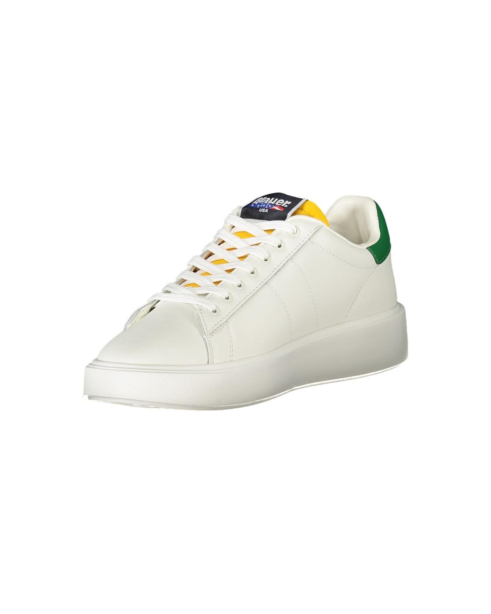 This men’s white leather sneaker features a sleek design with contrasting green accents and a dynamic print pattern. It is crafted for comfort and style, making it suitable for various casual occasions.