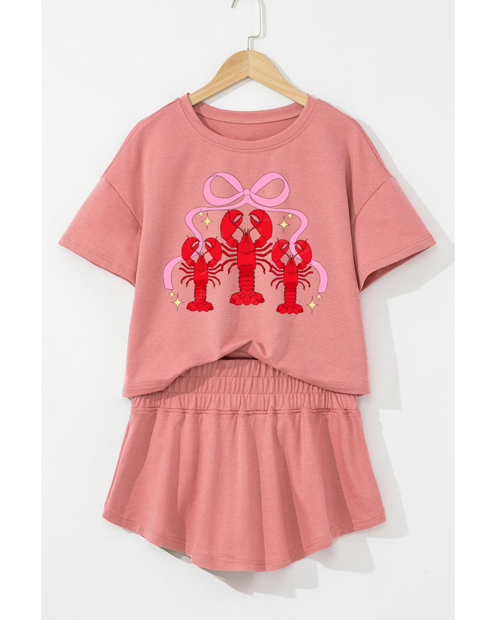 This set features a stylish crawfish print T-shirt paired with high waist ruffle skorts, perfect for casual and trendy looks. Designed for women, it combines comfort with fashionable details, making it suitable for various occasions.