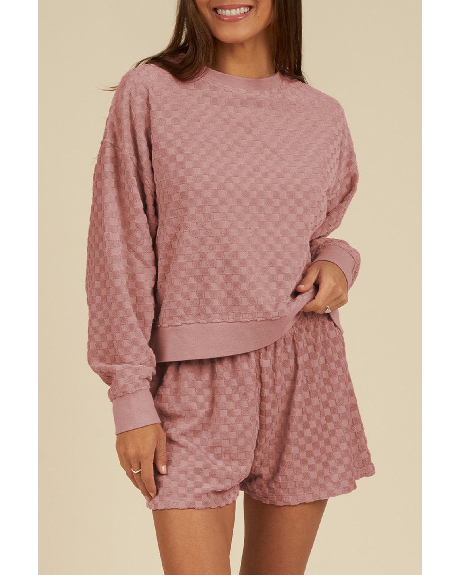 This checkered textured long sleeve top and shorts set offers a stylish and versatile outfit option. Designed with a trendy fitted silhouette, it combines comfort and fashion for various occasions. The set features a classic crew neck and long sleeves, making it suitable for different weather conditions and styling preferences.