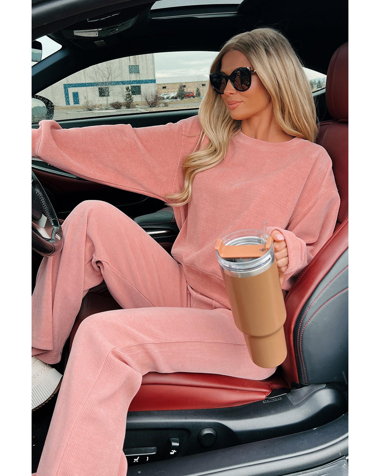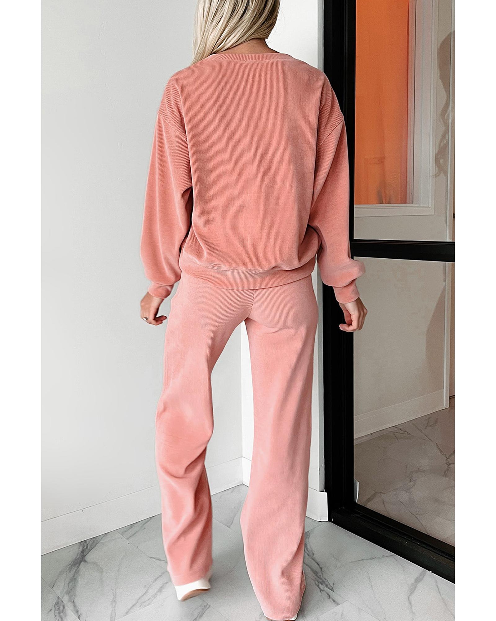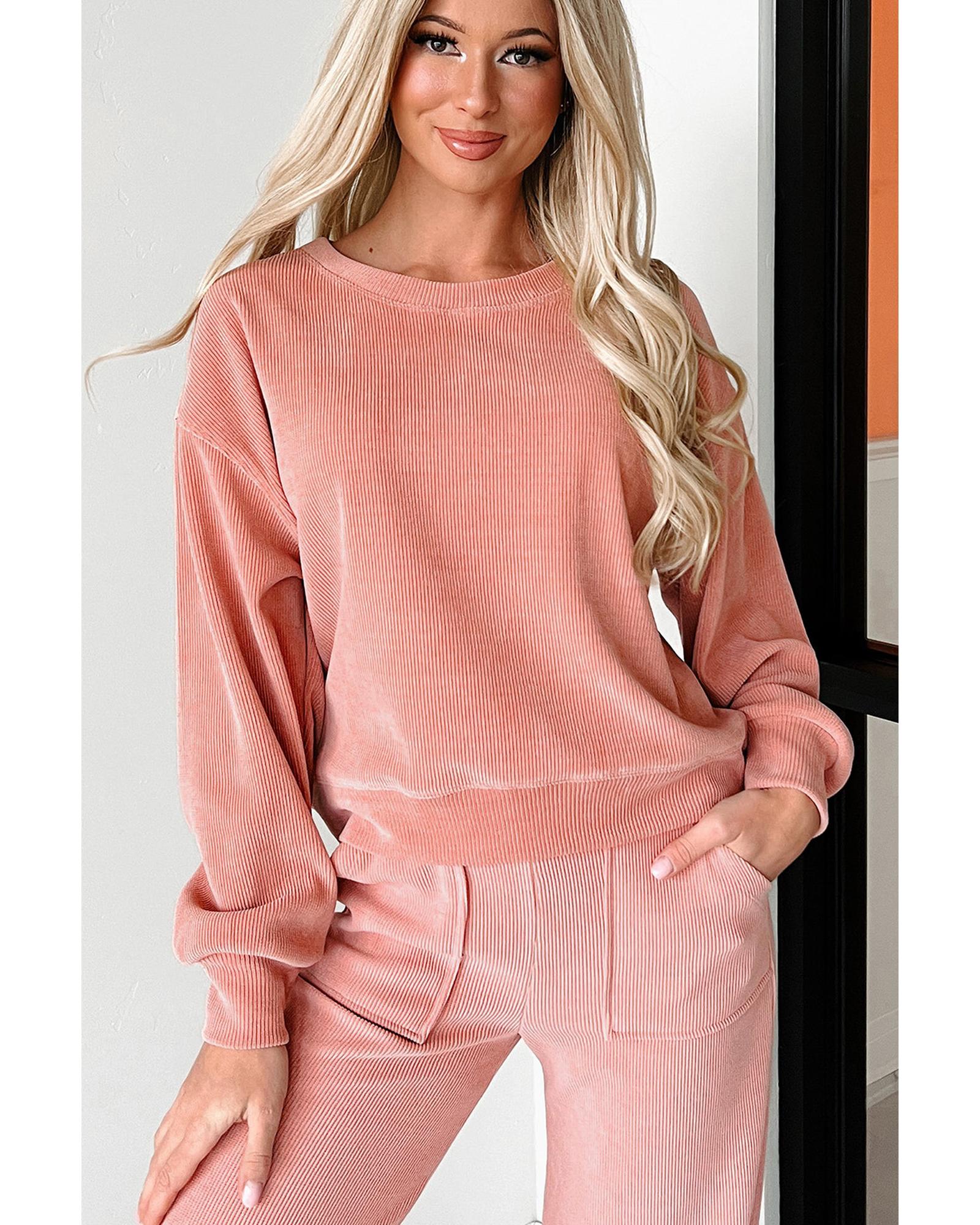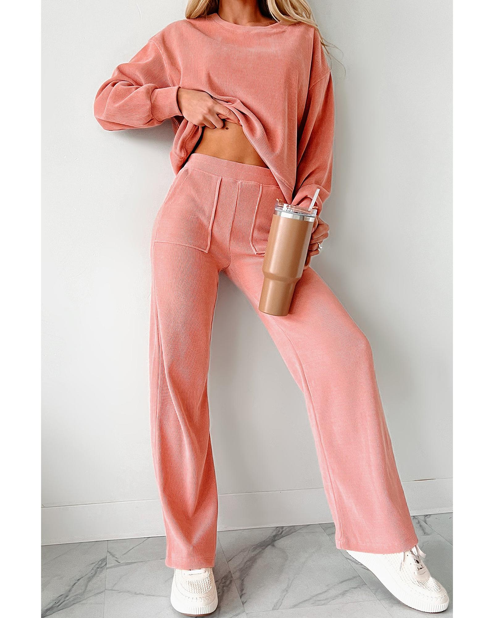 Blossom Ribbed Knit Drop Shoulder Pocketed Two Piece Lounge Set – S