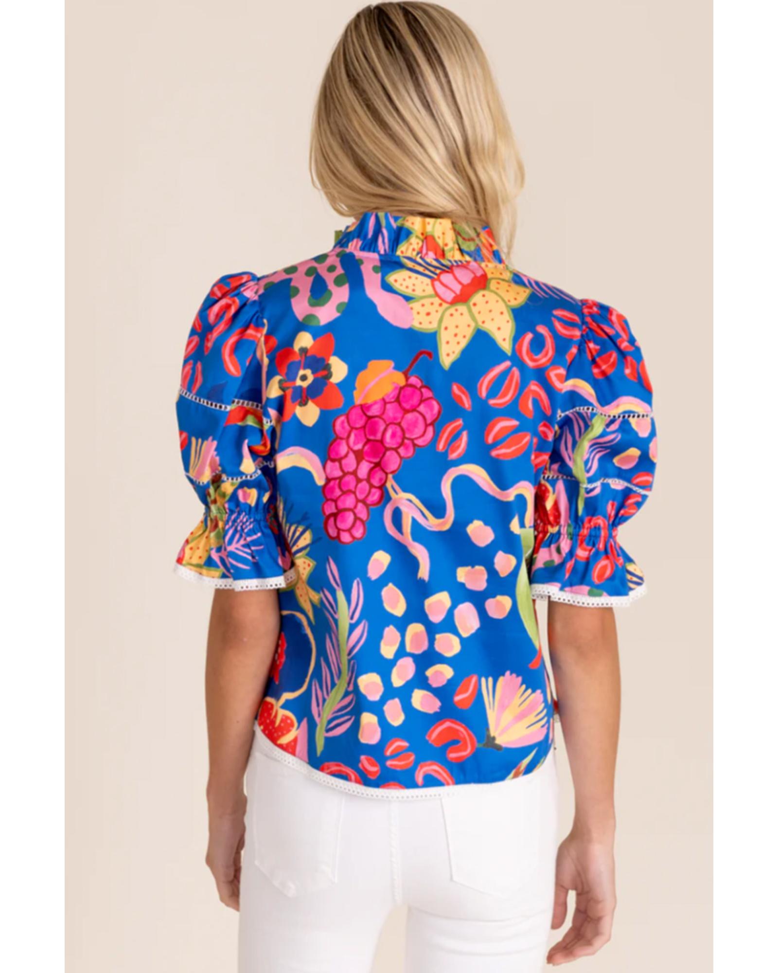 Blue Abstract Print Frilled Collar Ruffled Puff Short Sleeve Top – L