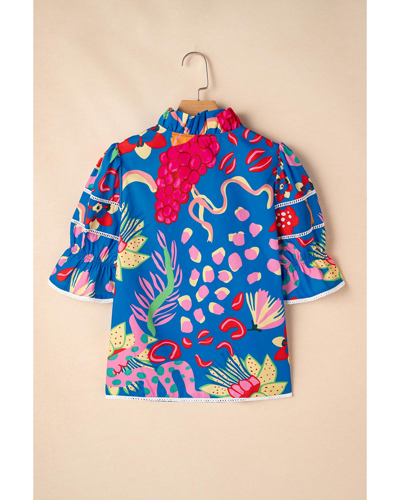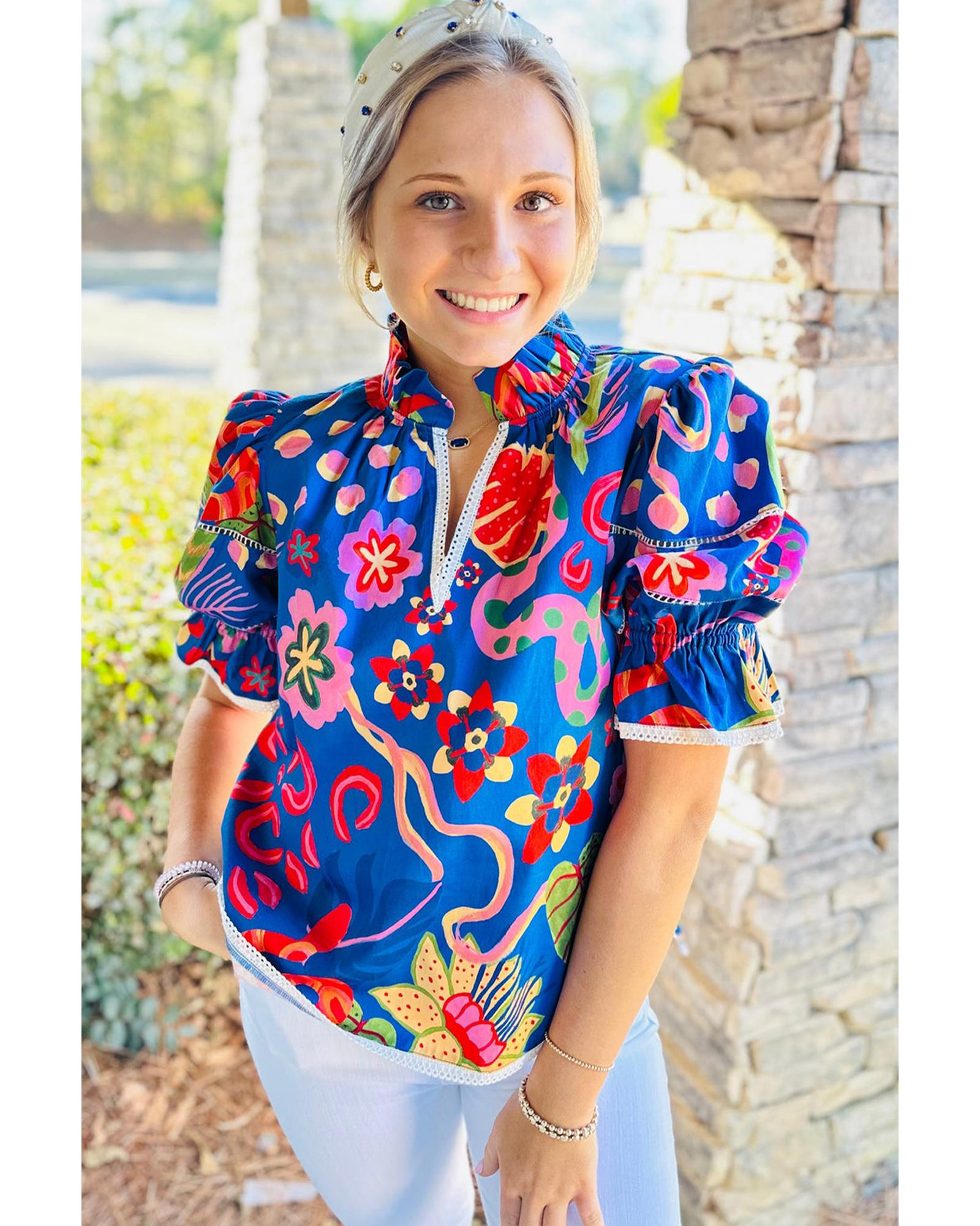 This stylish top features a unique abstract print combined with elegant design details, making it a versatile addition to your wardrobe. The ruffled puff short sleeves and frilled collar add a feminine touch, while the contrast lace trim enhances its overall charm.