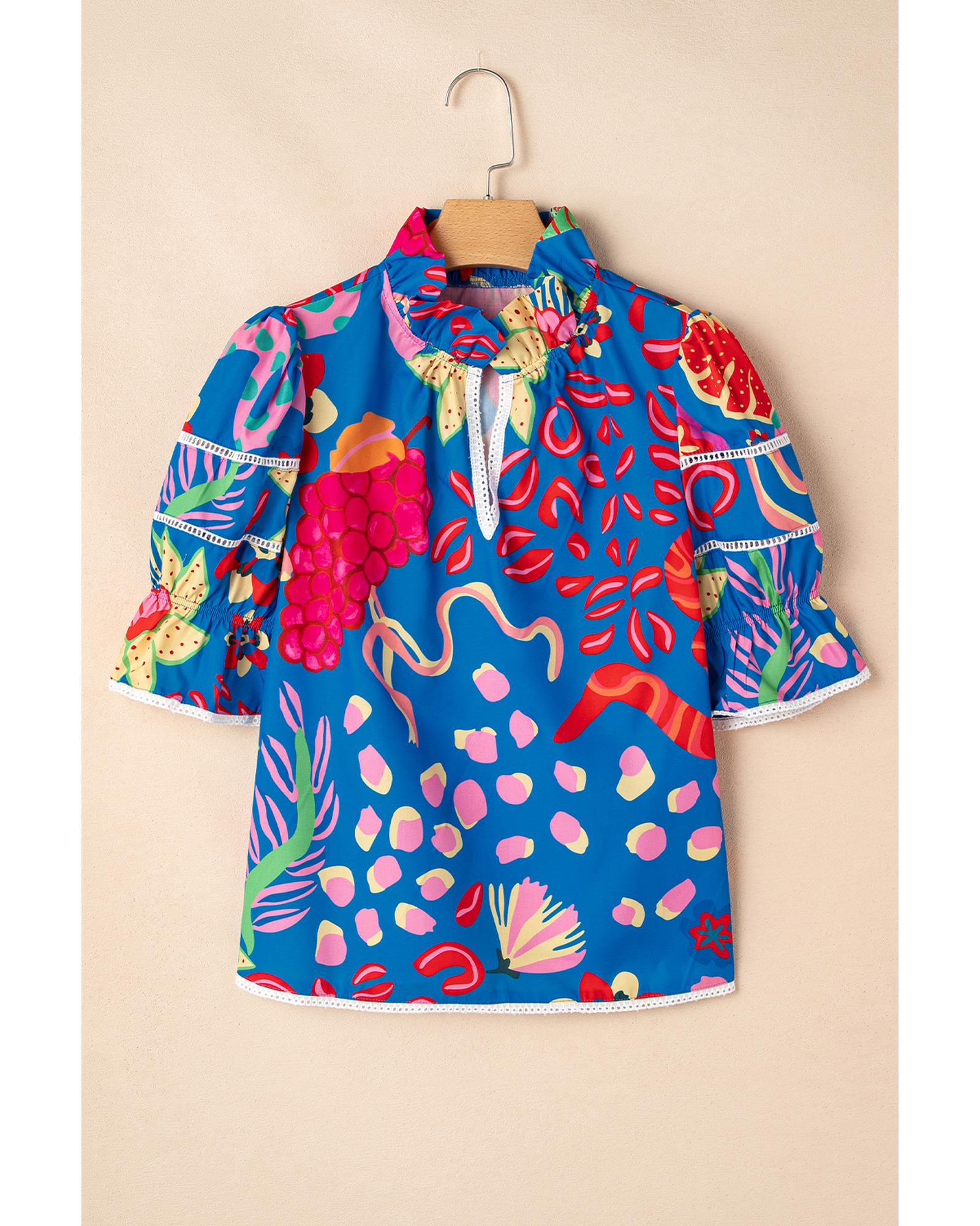 This stylish top features a unique abstract print combined with elegant design details, making it a versatile addition to your wardrobe. The ruffled puff short sleeves and frilled collar add a feminine touch, while the contrast lace trim enhances its overall charm.