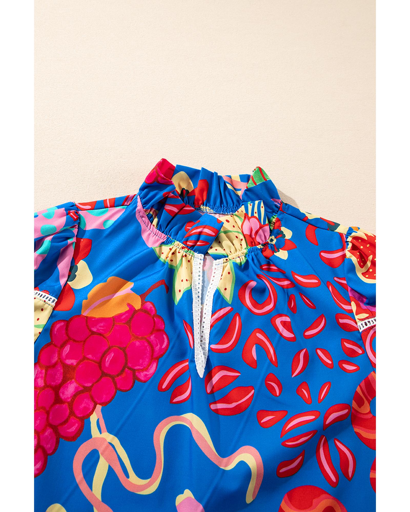 Blue Abstract Print Frilled Collar Ruffled Puff Short Sleeve Top – S