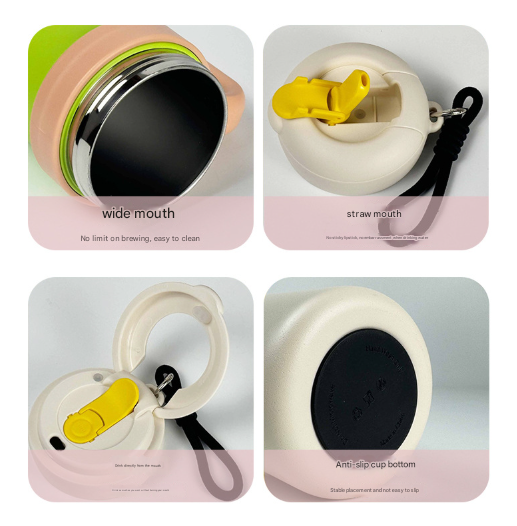 • Features: vacuum insulation, dual drinking options, handle, carry lanyard, detachable tea infuser, leak-proof, non-slip base