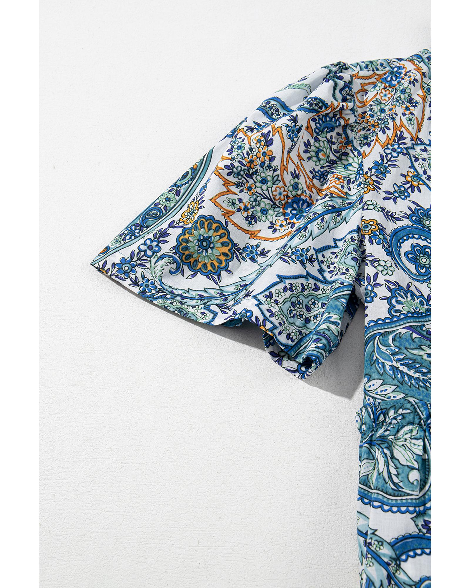 Blue Bohemian Paisley Floral V Neck Short Sleeve Mini Dress – S