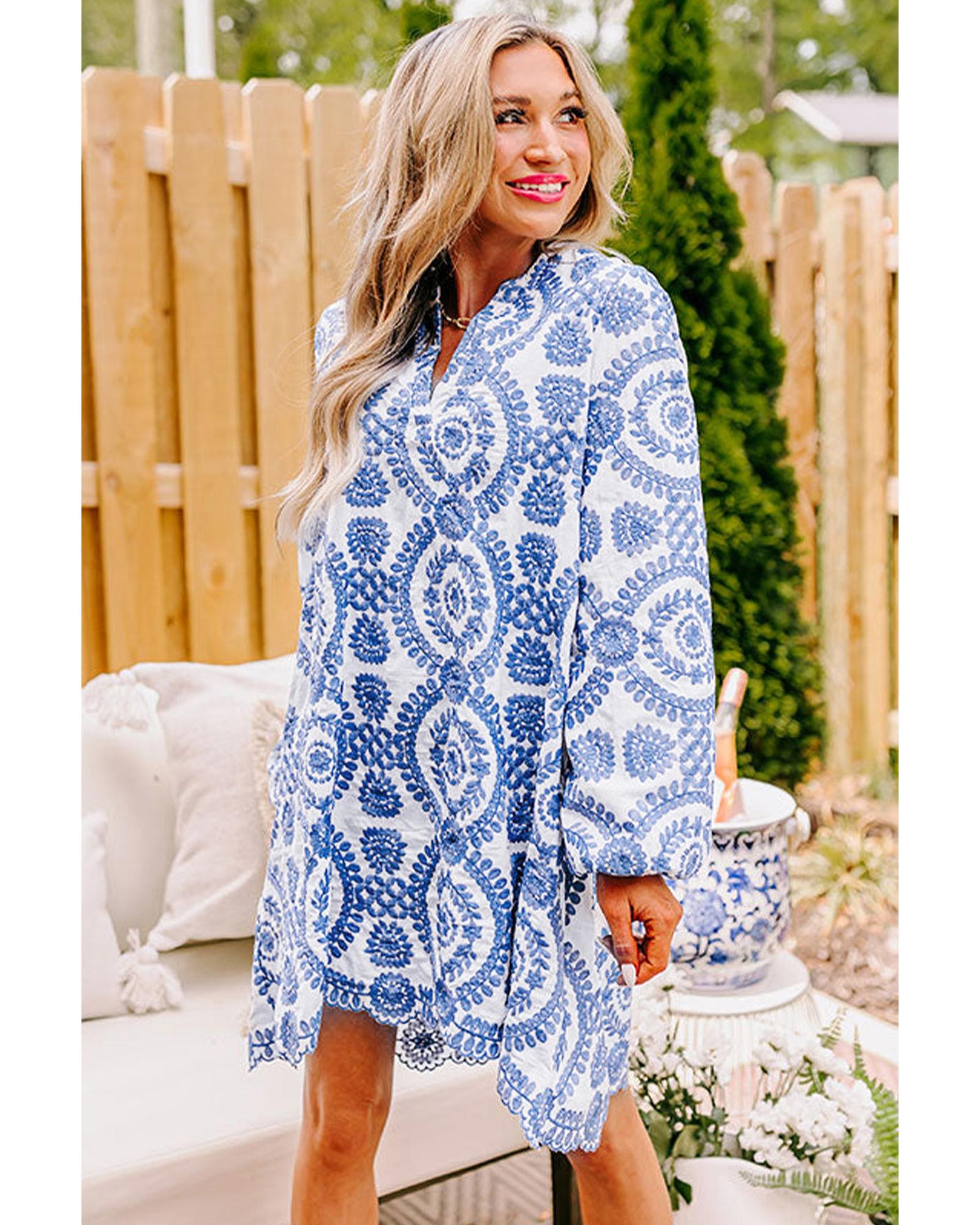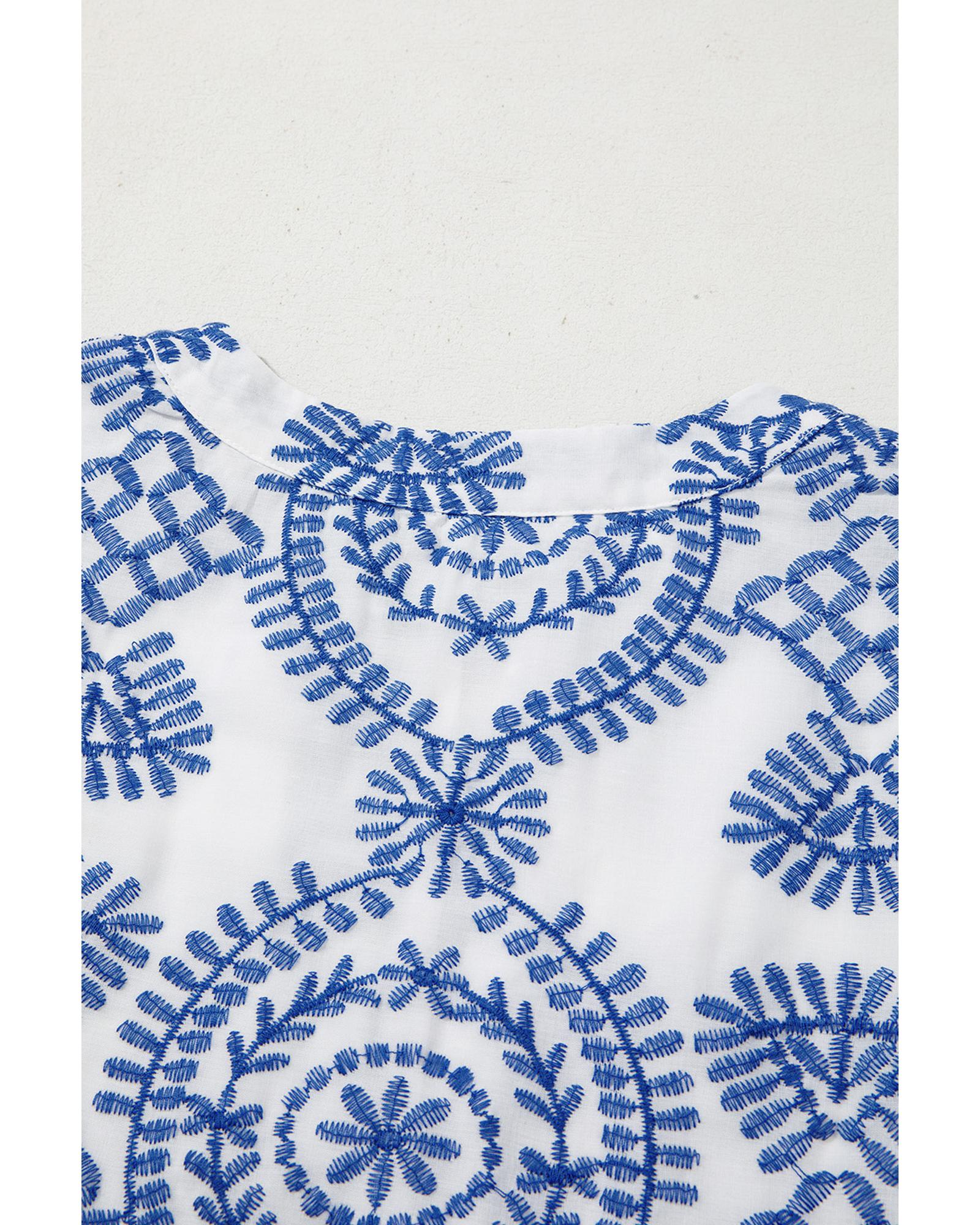 Blue Boho Floral Embroidered Notch V Neck Shift Mini Dress – L
