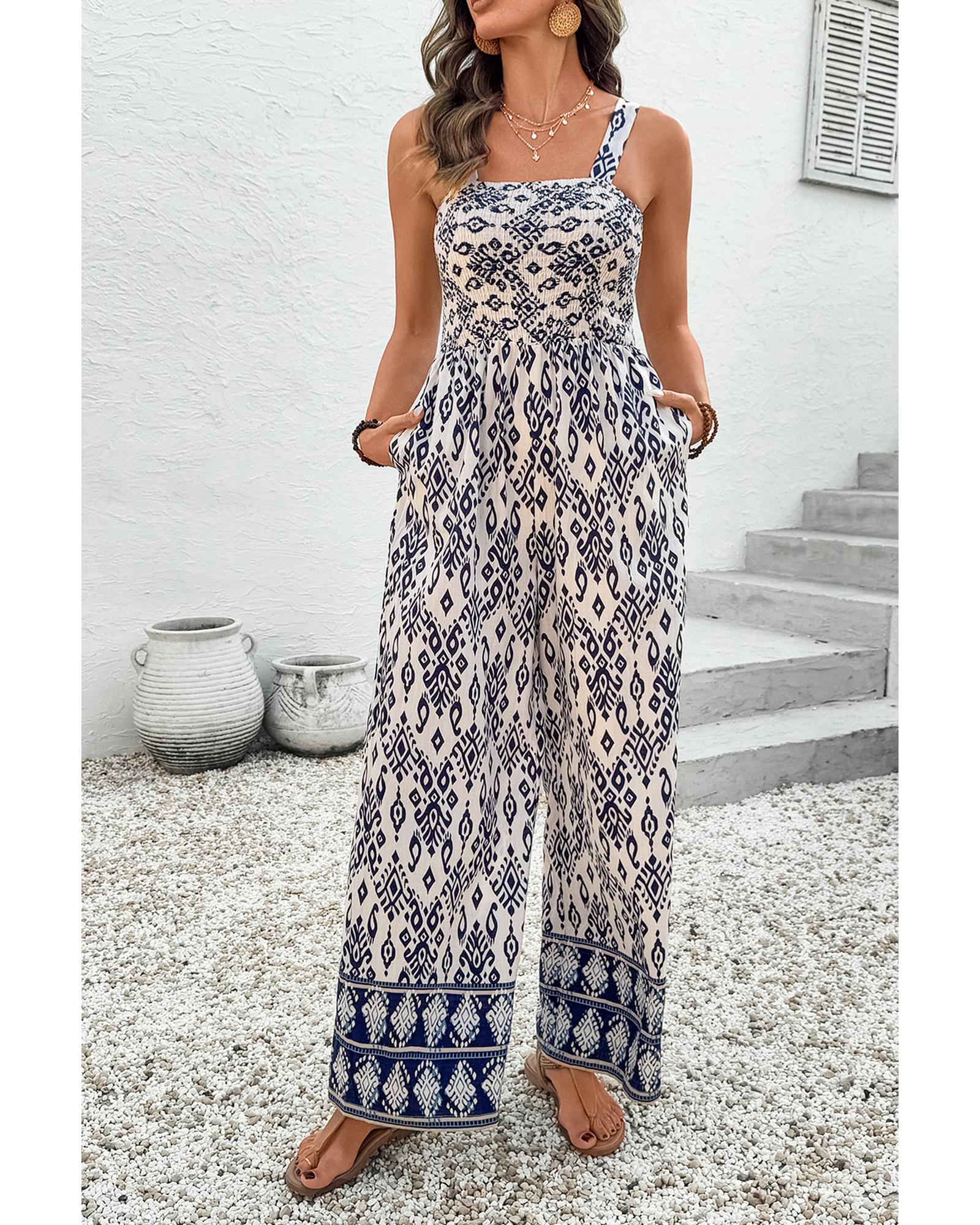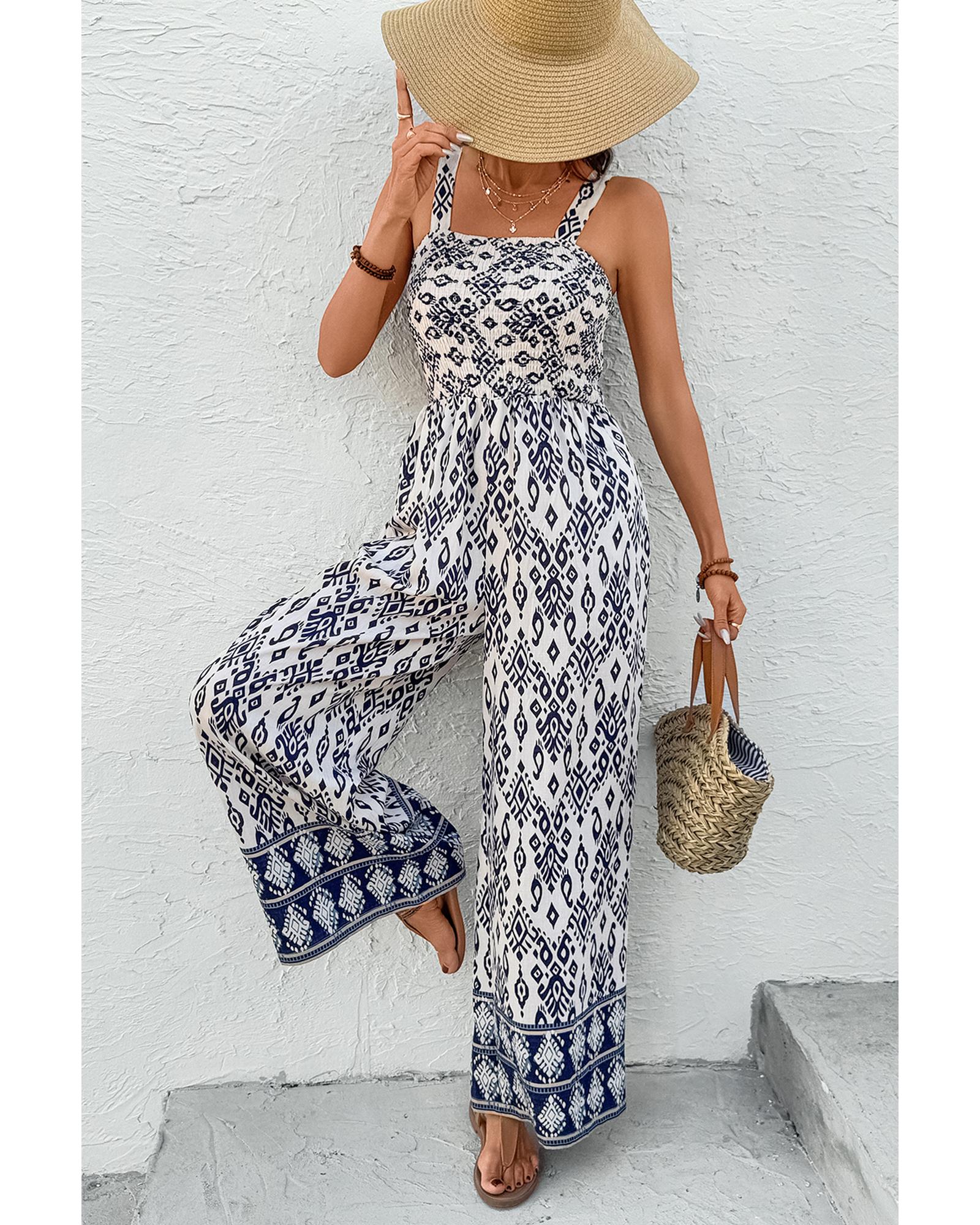 Blue Boho Geometric Print Shirred High Waist Wide Leg Jumpsuit – S