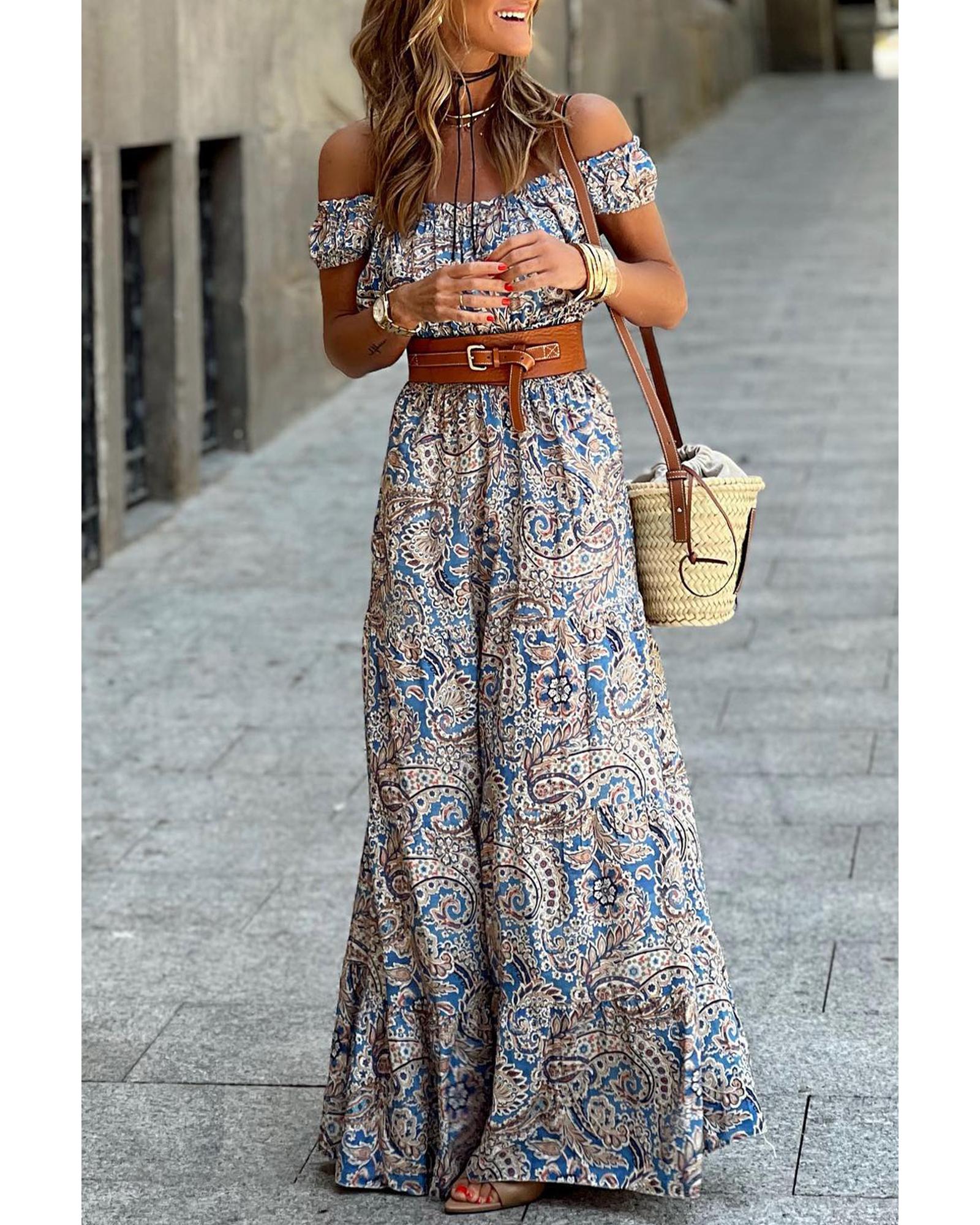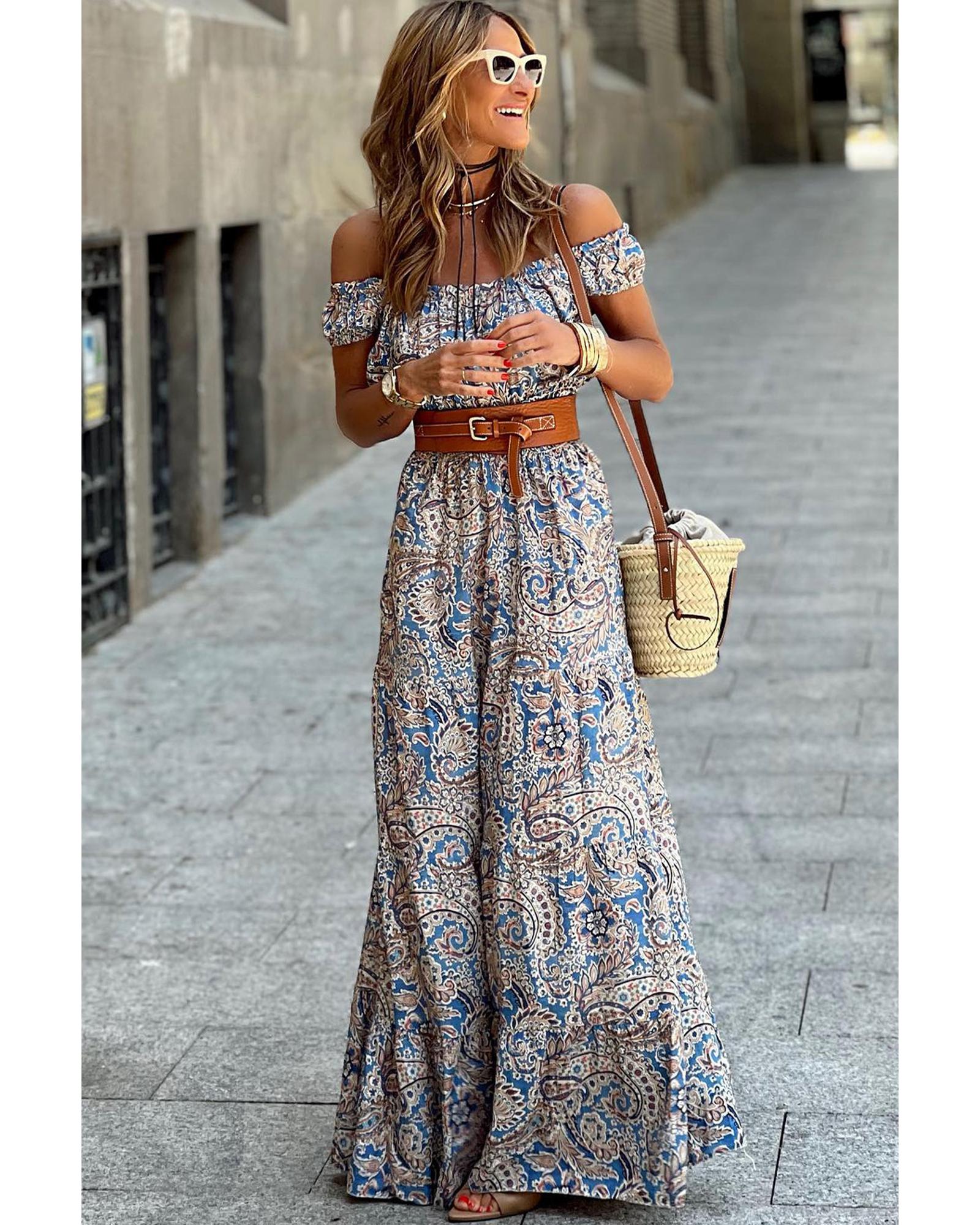 Blue Boho Paisley Print Off Shoulder Maxi Dress – XL