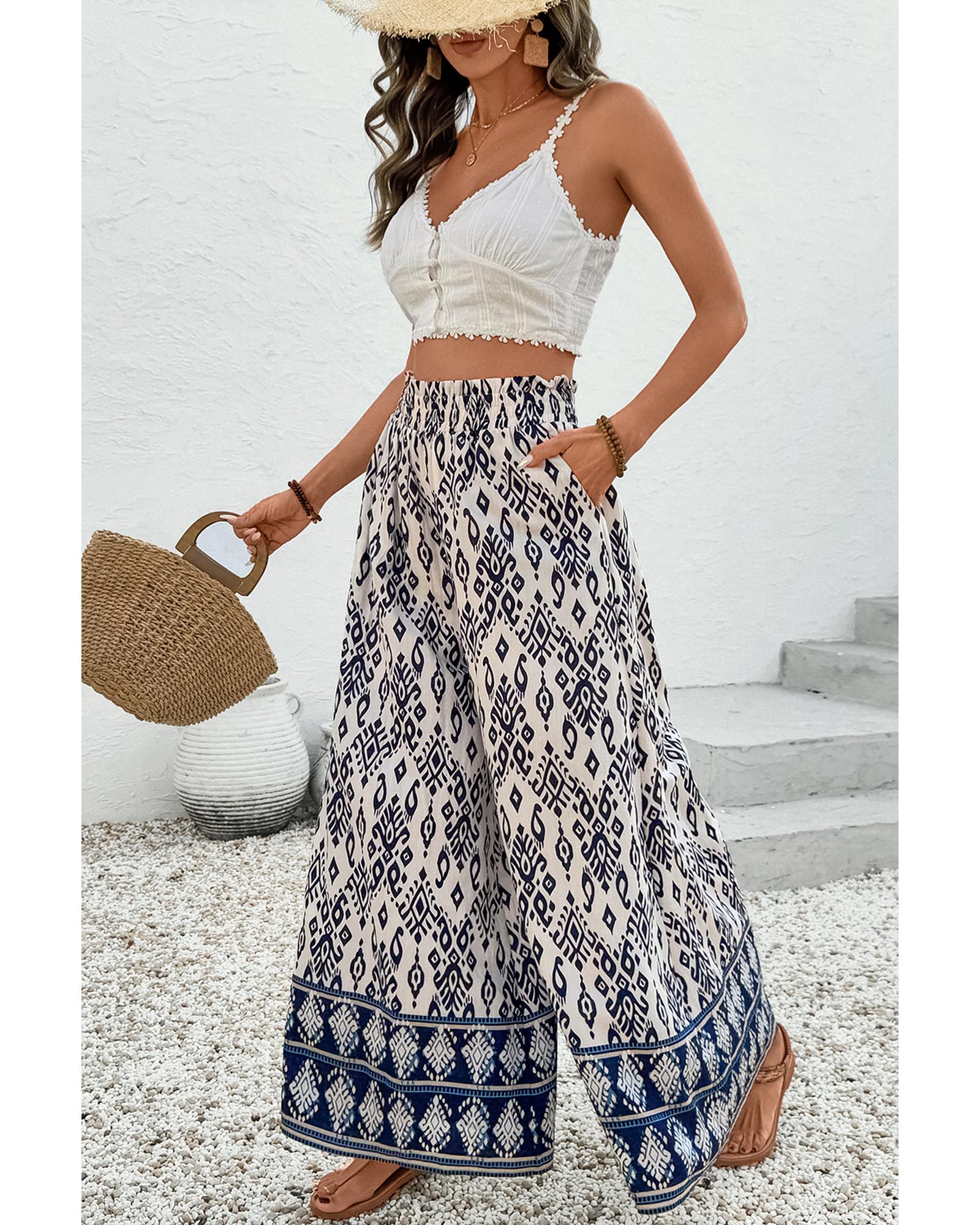 These high waist wide leg pants feature a boho chic pattern print, offering a stylish and comfortable option for casual wear. The relaxed fit and loose silhouette provide ease of movement and a laid-back vibe, making them suitable for various occasions.