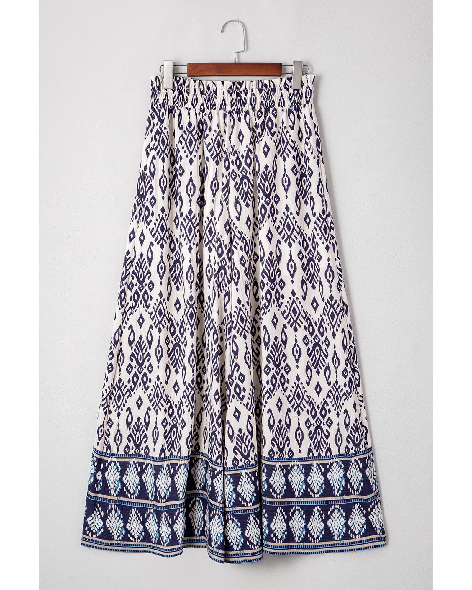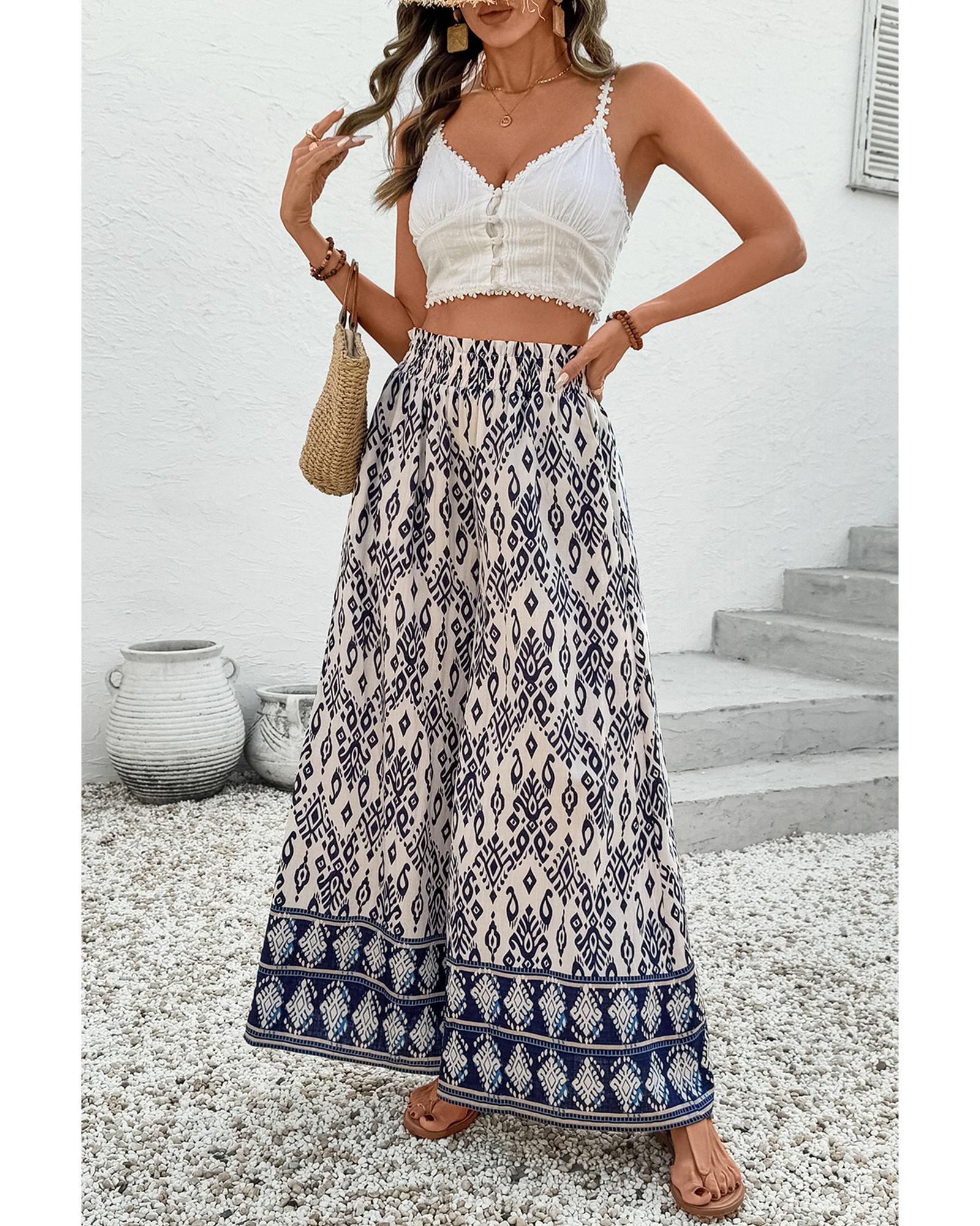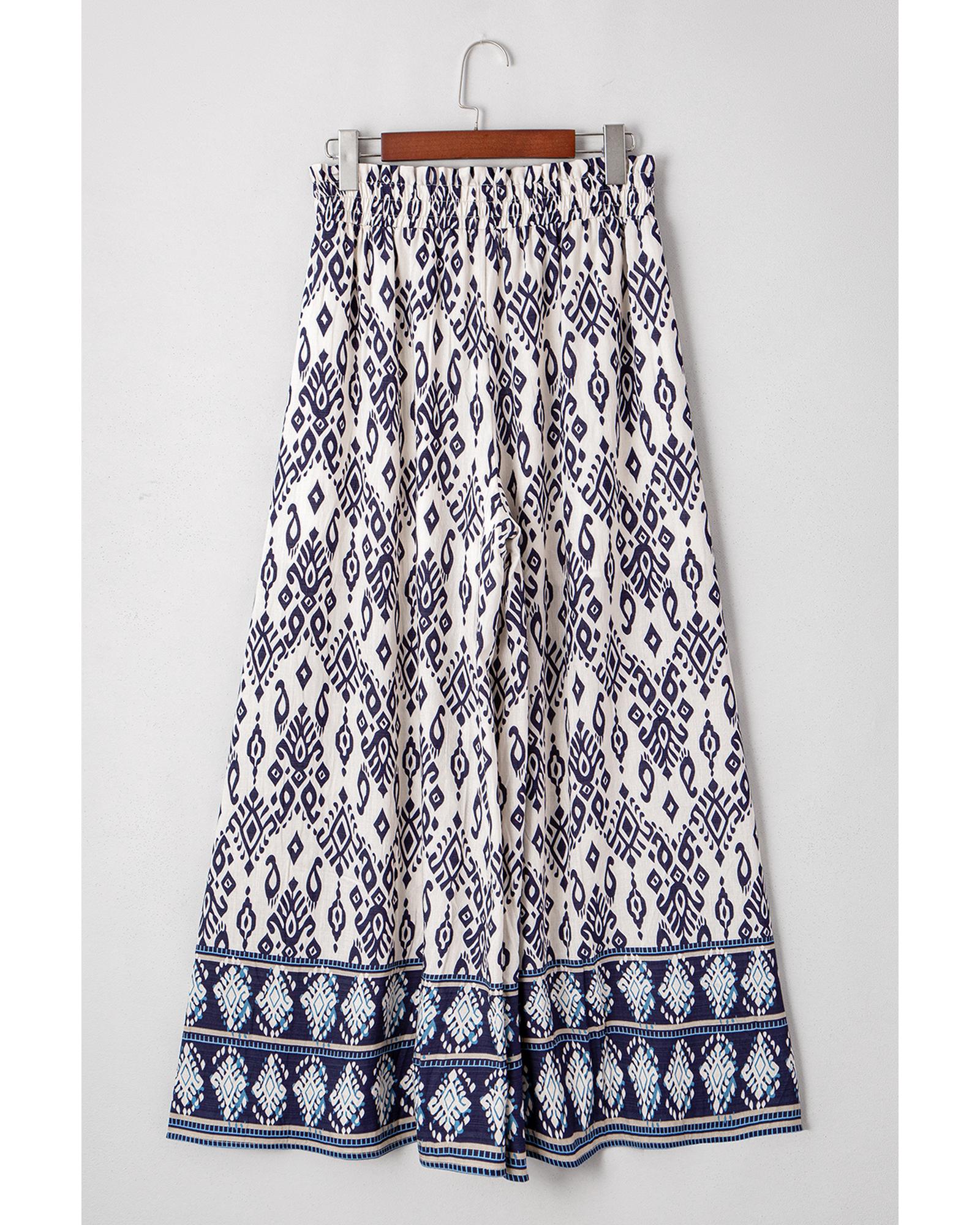 Blue Boho Pattern Print High Waist Wide Leg Loose Pants – M
