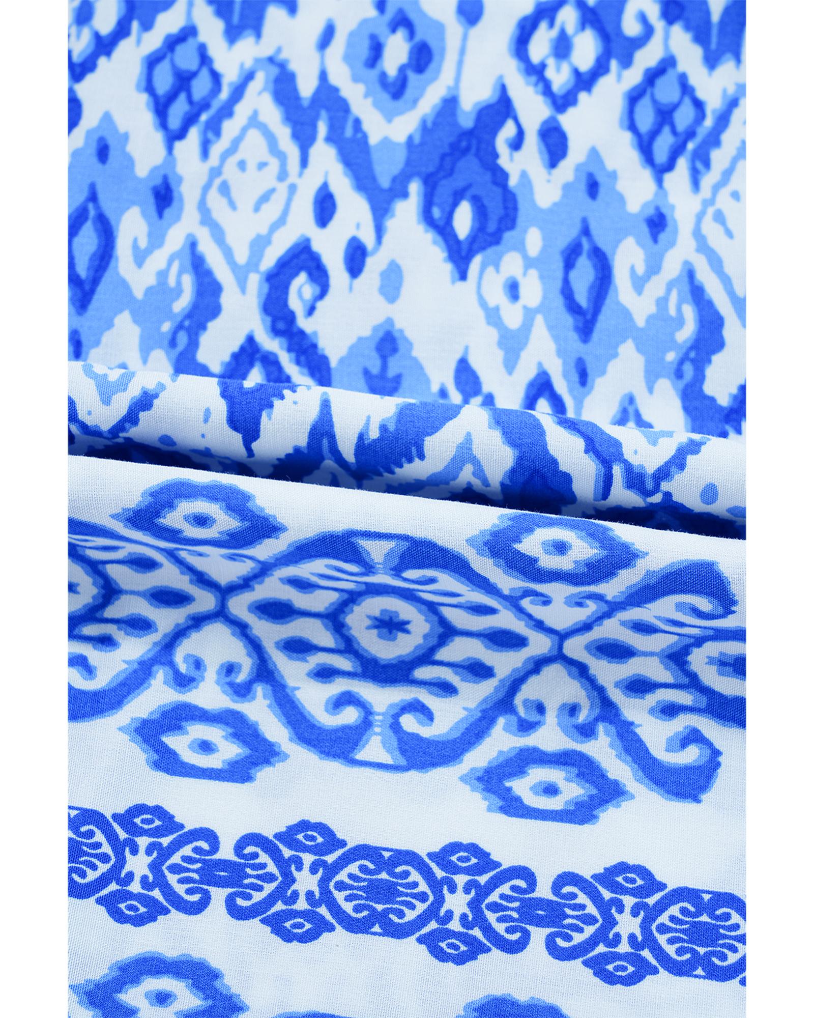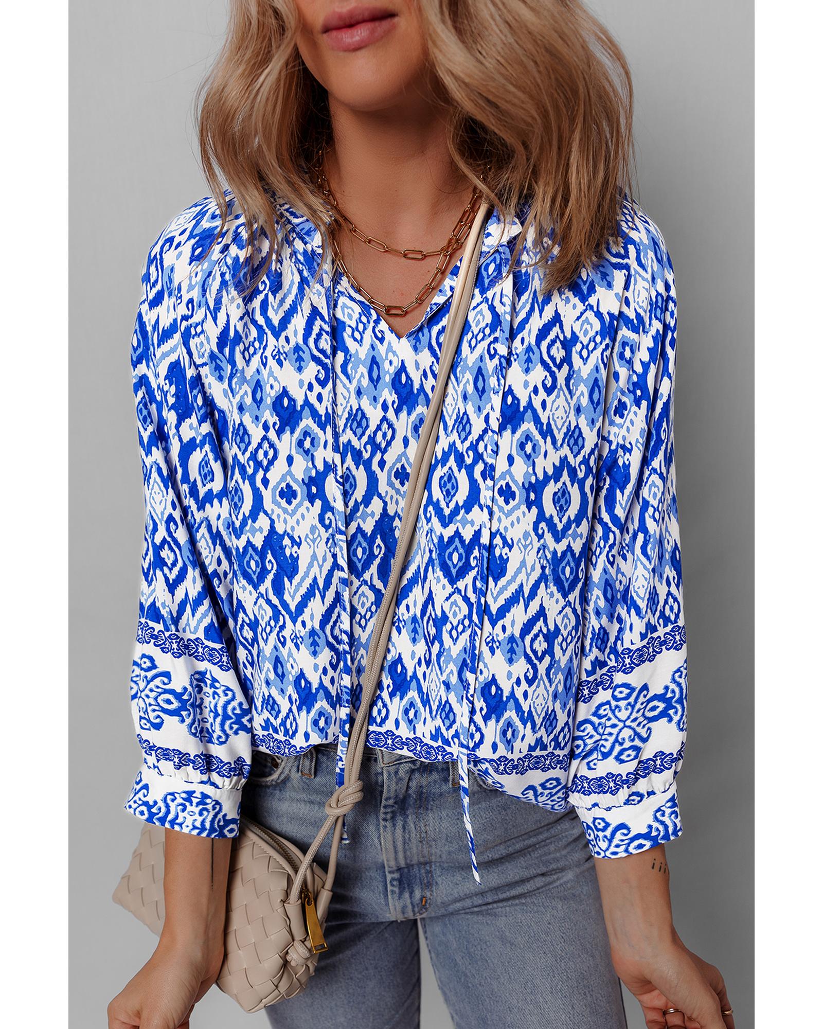 Blue Boho Printed 3/4 Sleeve Tied Neck Blouse – XL