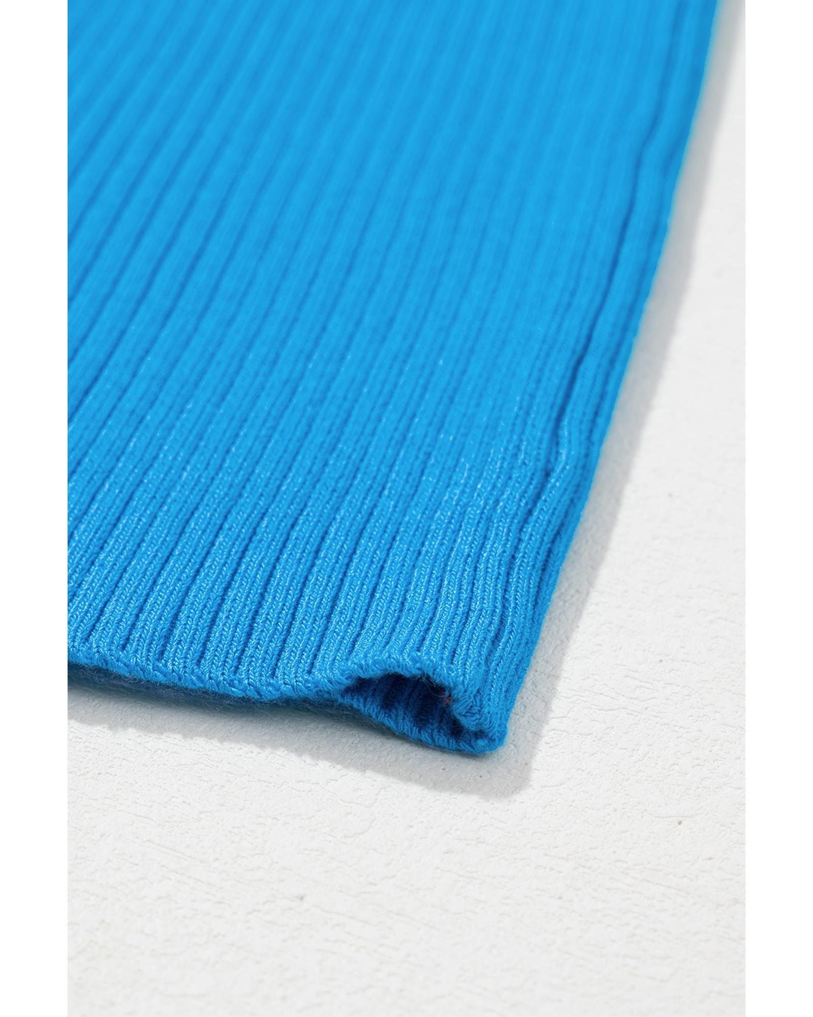 This blue colorblock edge ribbed knit U-neck tank top combines a trendy fitted design with a comfortable fit. Crafted from a soft woolen knit material, it features a ribbed texture and contrast color trimming around the neckline. Available in various colors and sizes, it offers high elasticity for ease of movement and a stylish appearance.