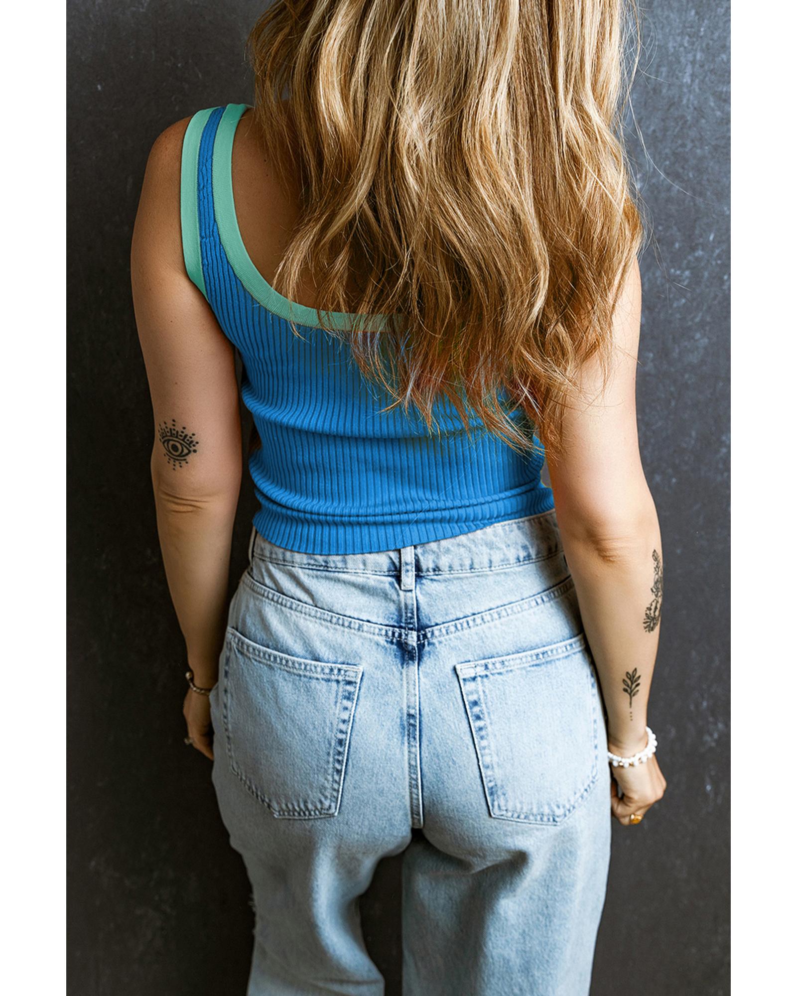 Blue Colorblock Edge Ribbed Knit U Neck Tank Top – XL
