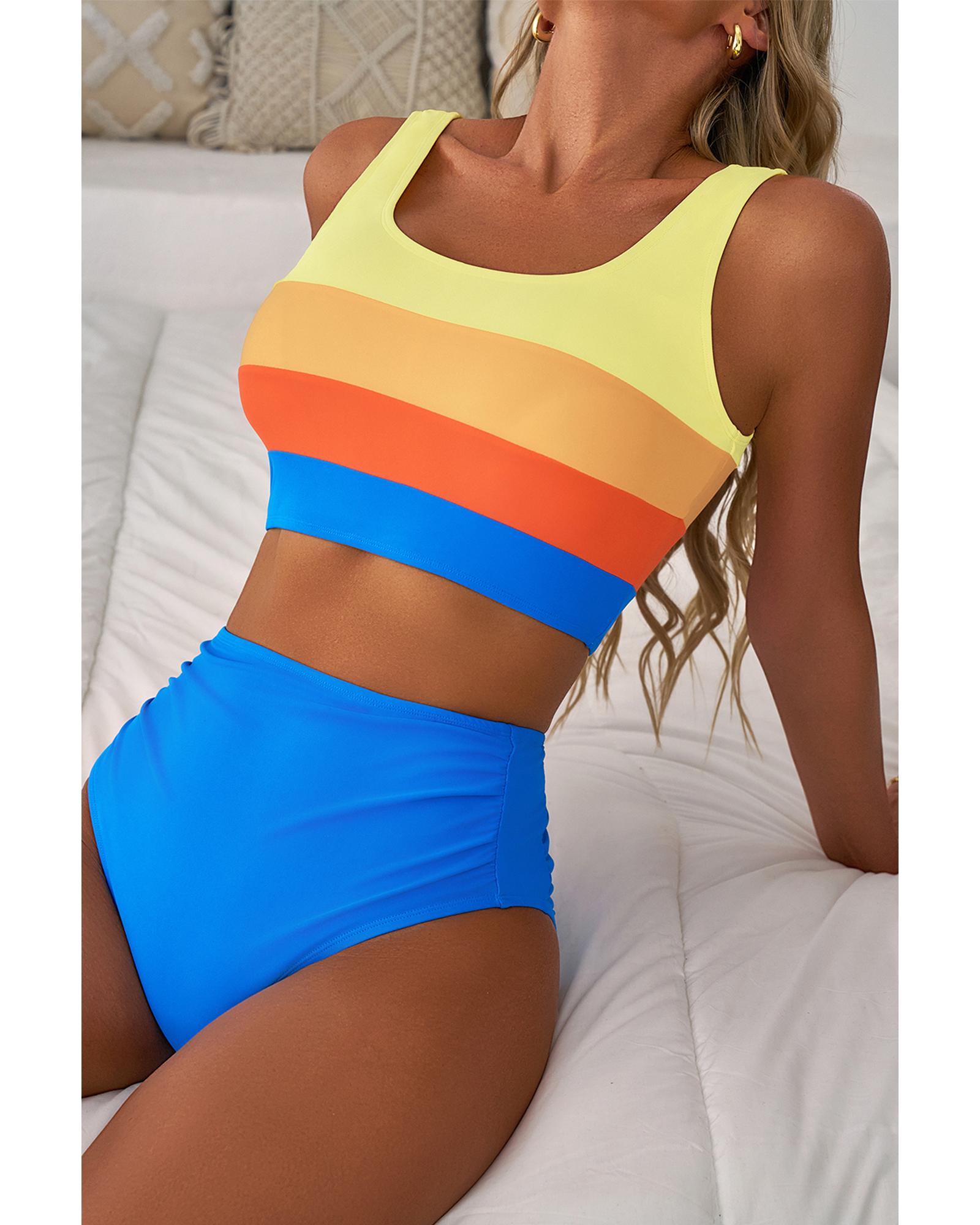 This stylish blue colorblock bikini features a square neckline and pleated high-waisted bottoms, offering a trendy and flattering look for poolside lounging. Designed for comfort and style, it is suitable for all-day wear and various water activities.