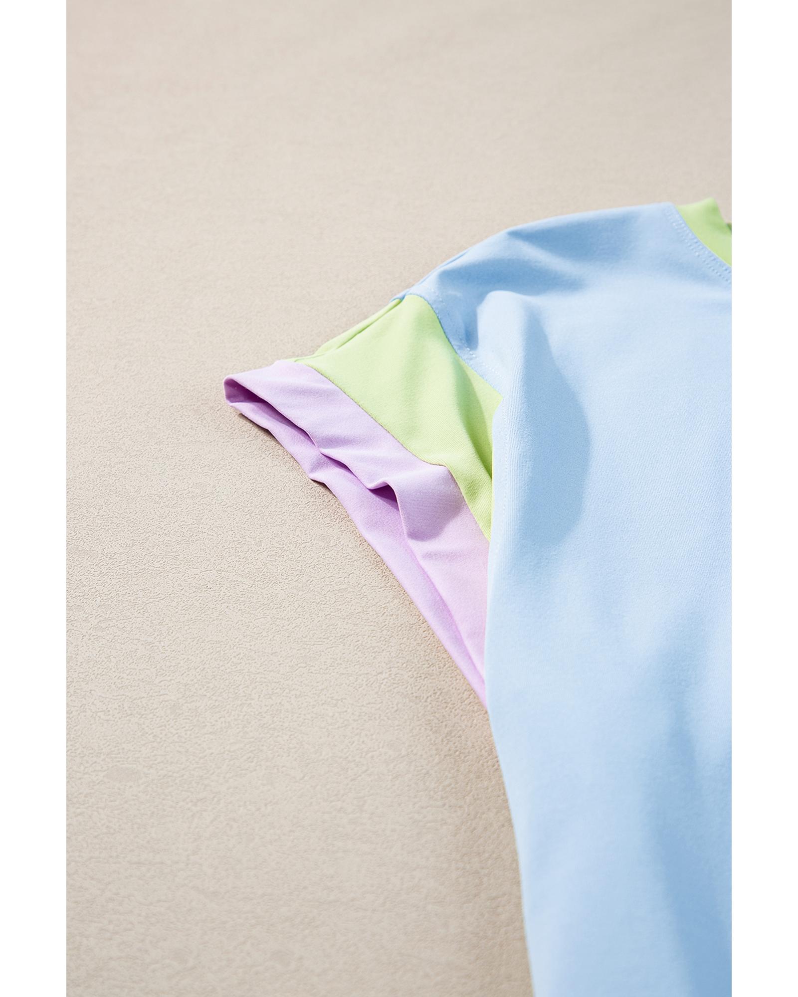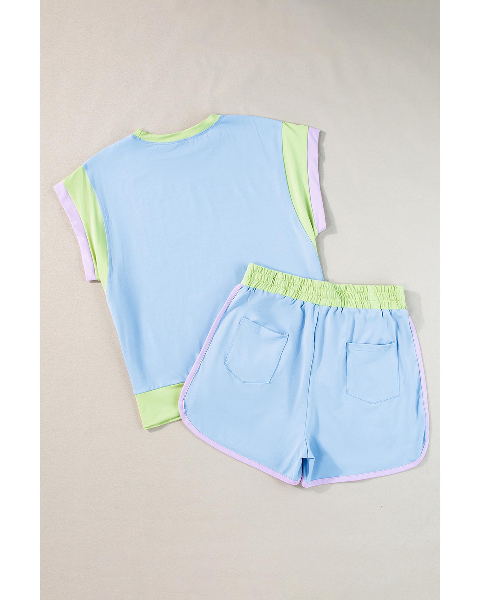 This stylish two-piece set features a cap sleeve tee and elastic waist shorts, designed for a relaxed and casual look. The contrast trim adds a trendy colorblock detail, making it suitable for daily wear and casual outings. Crafted from a comfortable blend of polyester and elastane, it offers a fashionable fit that combines comfort with style.