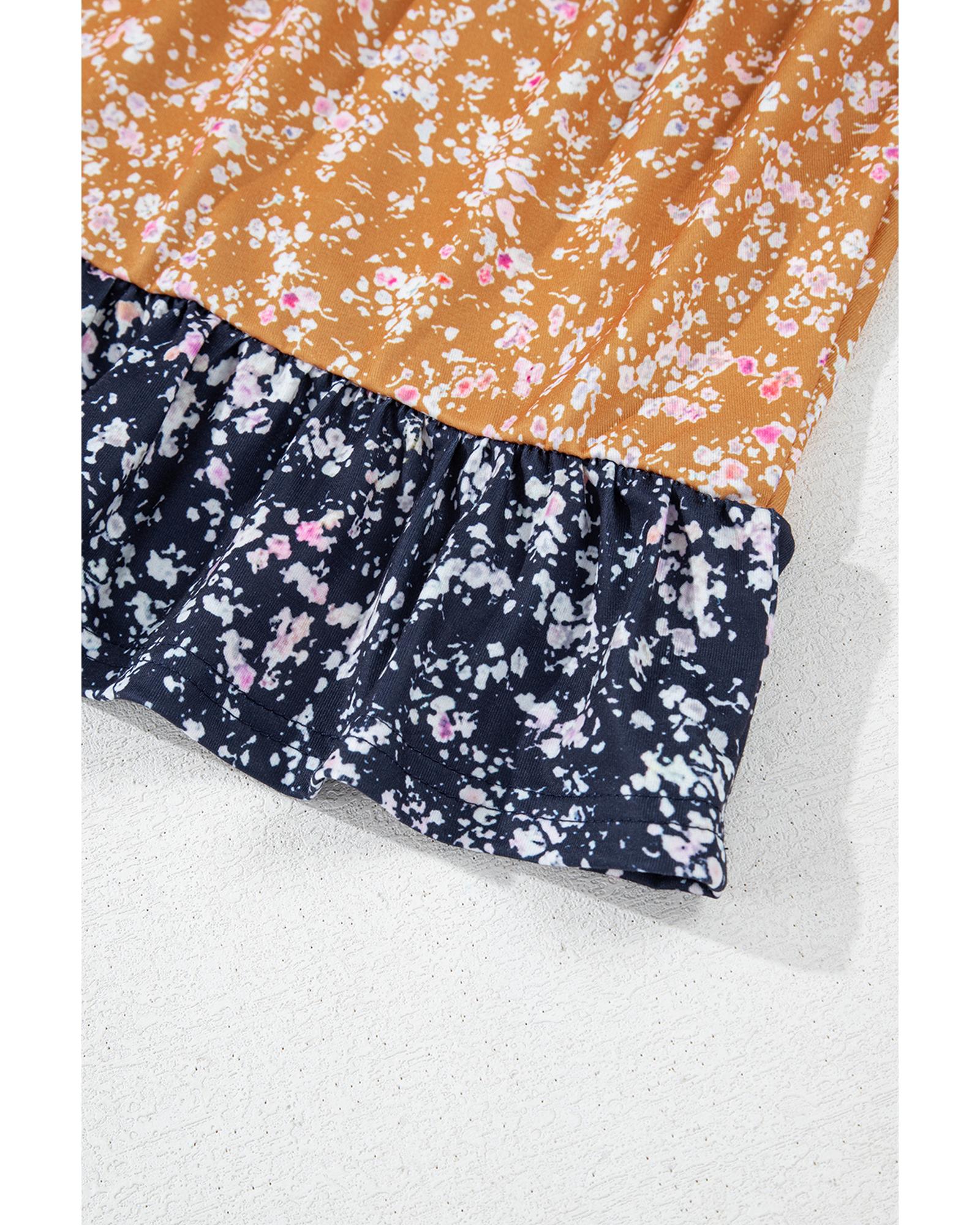 This blouse features a vibrant floral pattern combined with bold color block details, creating a stylish and modern look. The ruffled hemline adds a playful touch, while the round neck design offers a classic silhouette suitable for various occasions.