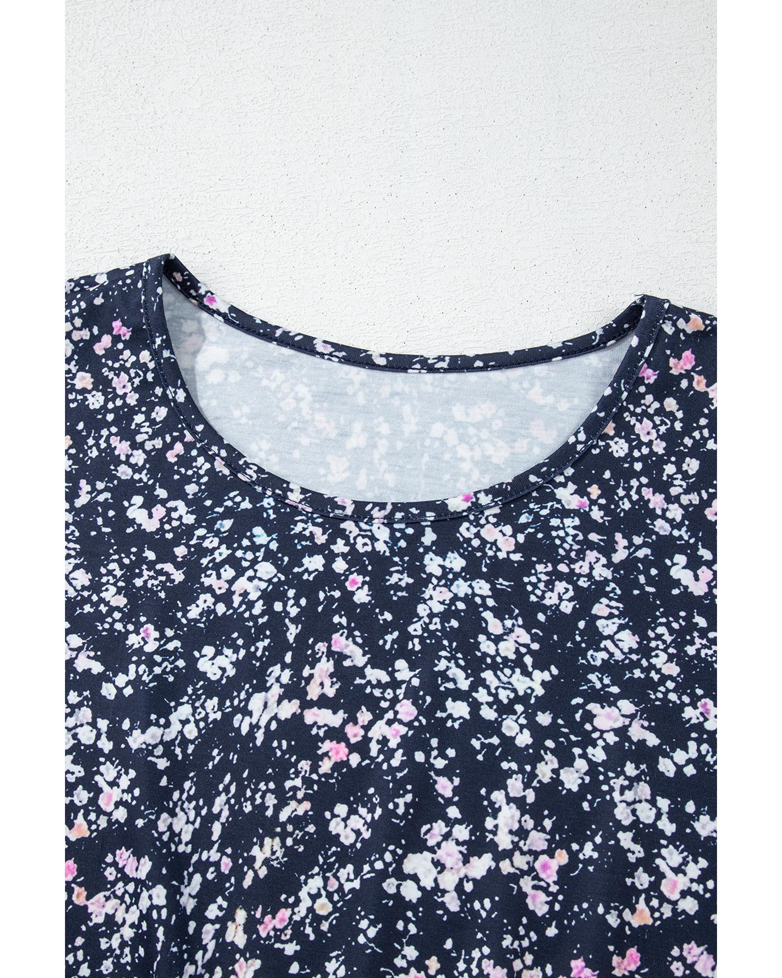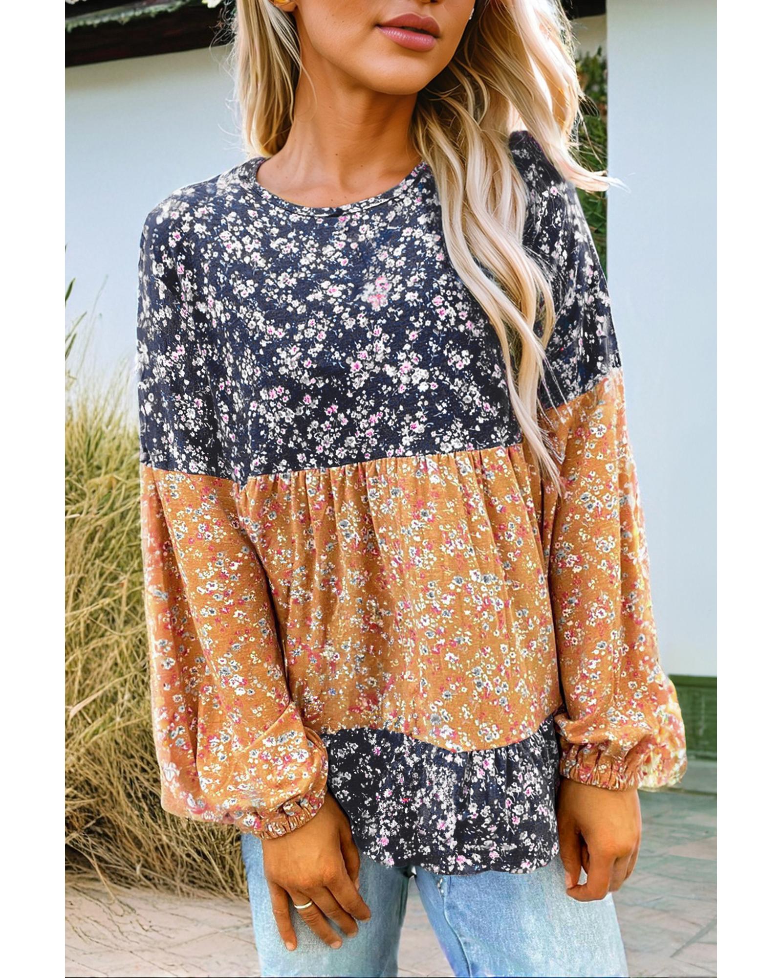 Blue Floral Color Block Patchwork Ruffled Hem Round Neck Blouse – M