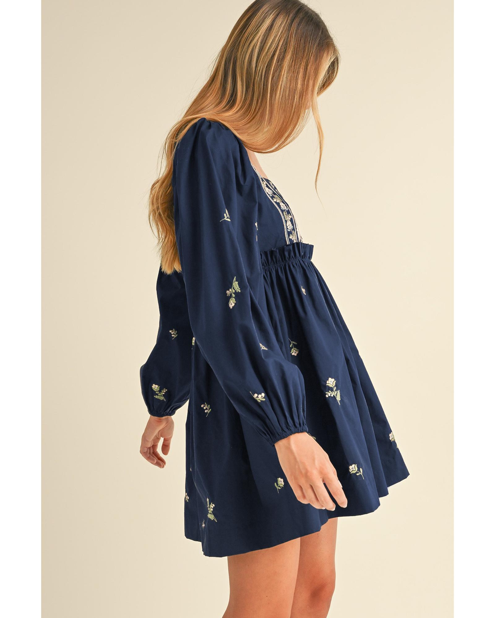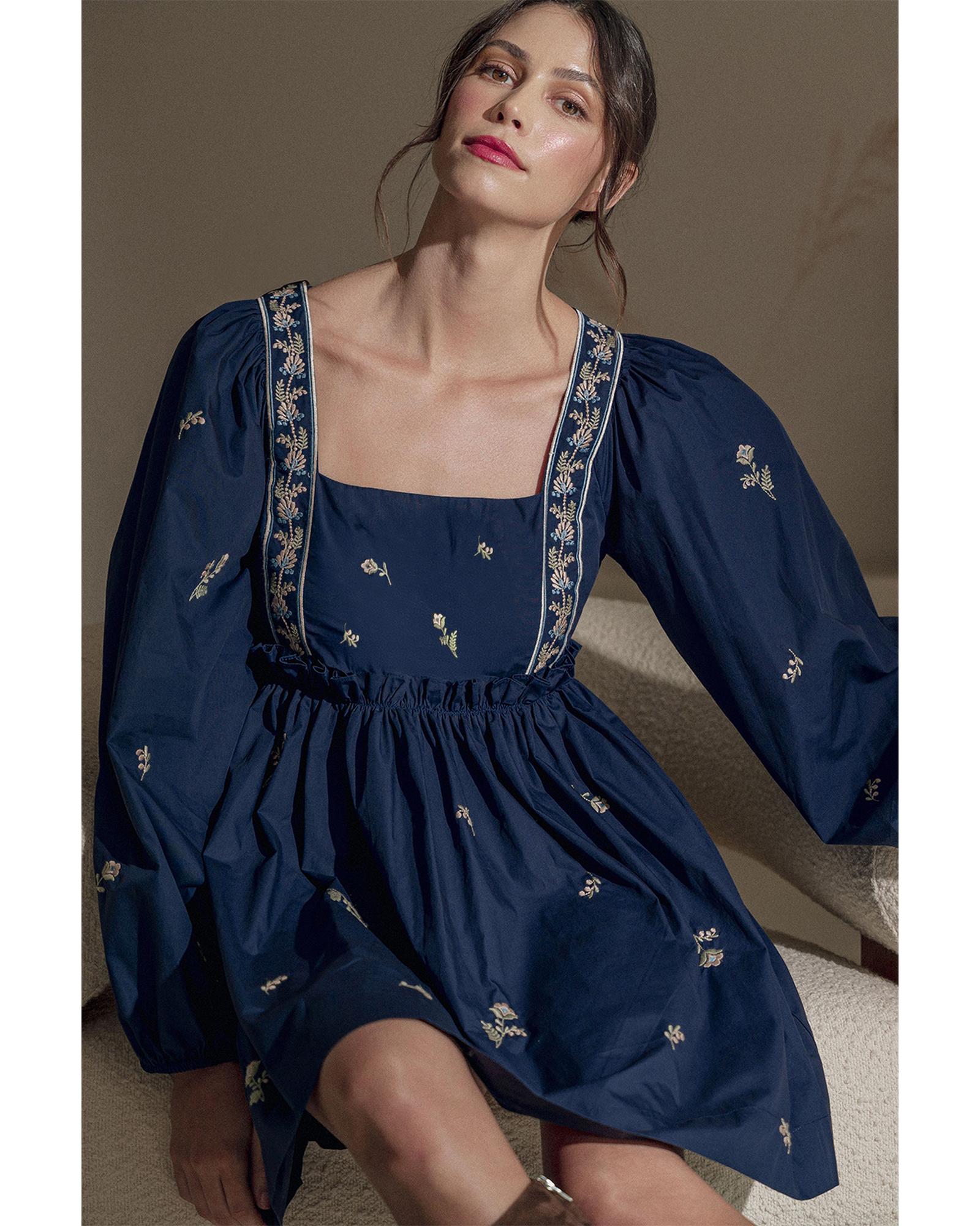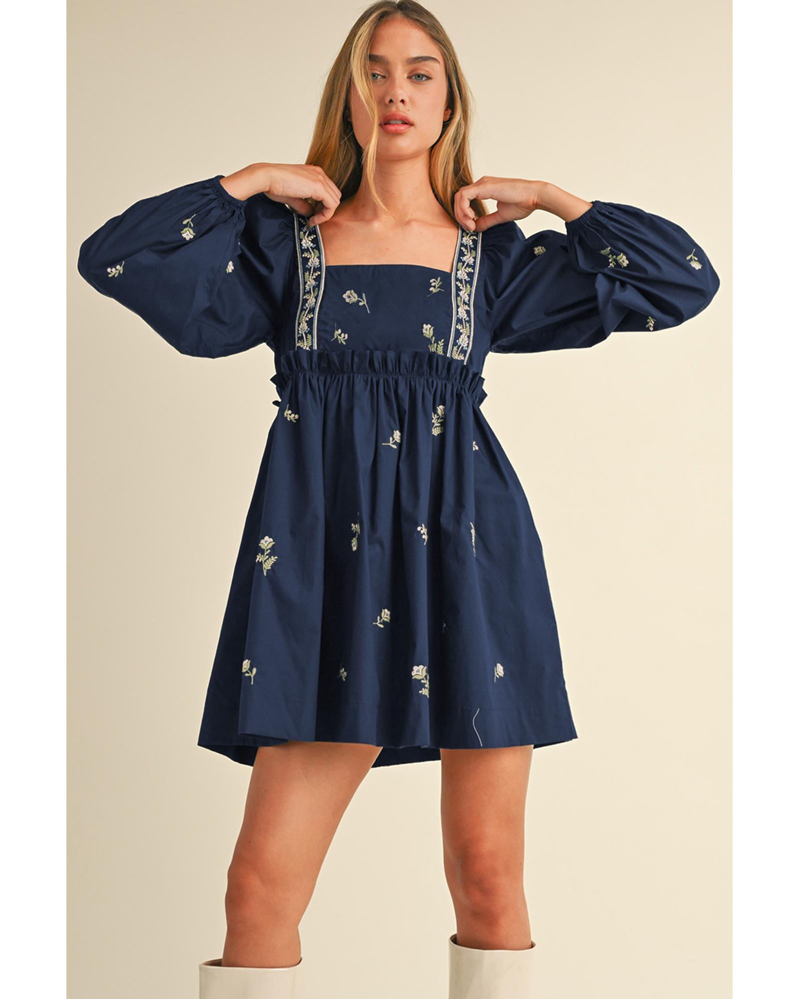 This blue floral embroidered mini dress features a stylish square neckline and puff sleeves, creating a feminine and sophisticated look. The high waist design and ruffled details add to its charming appearance, making it suitable for various occasions.