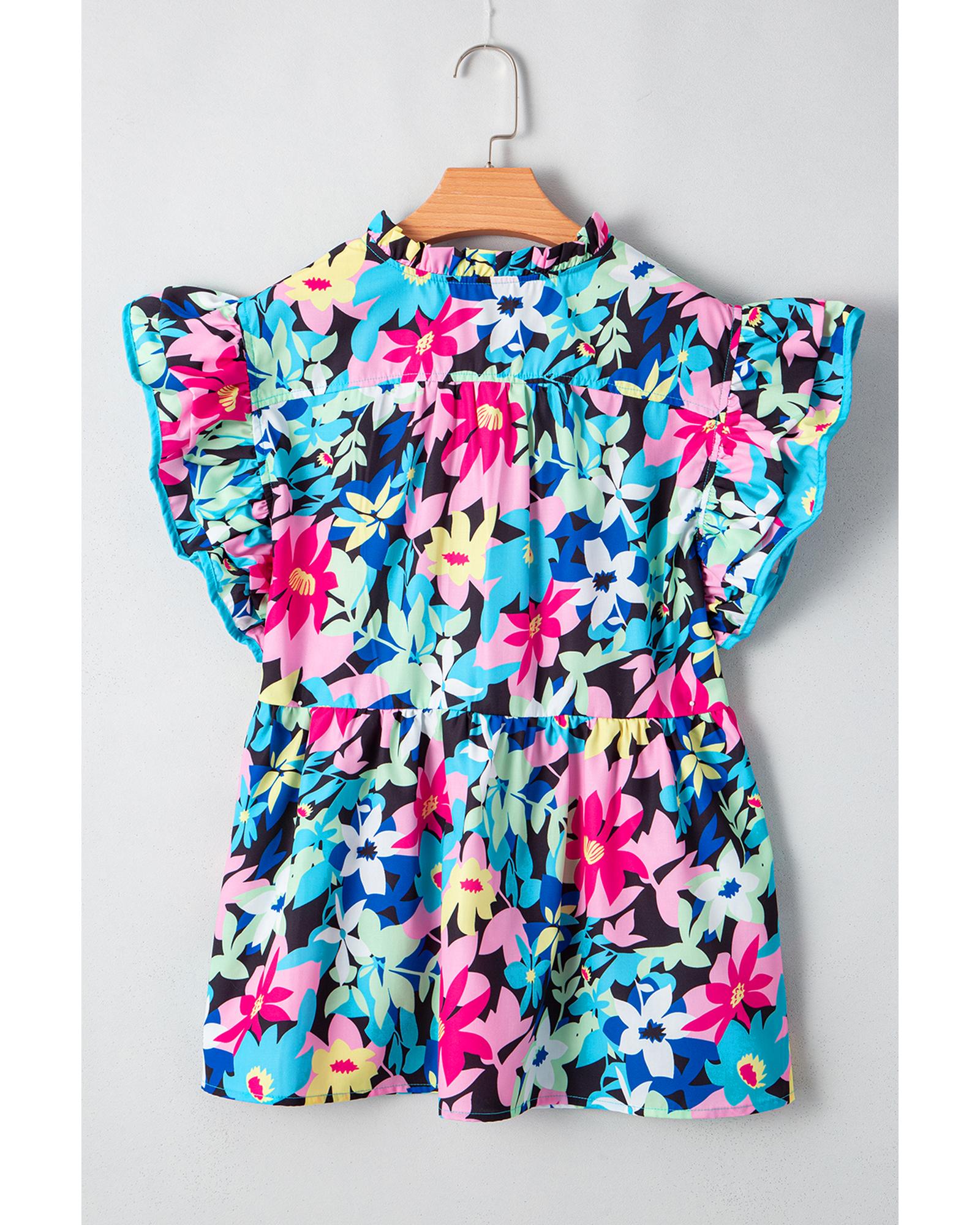 Blue Floral Flutter Sleeve Tied Notched Neck Plus Size Blouse – 4X