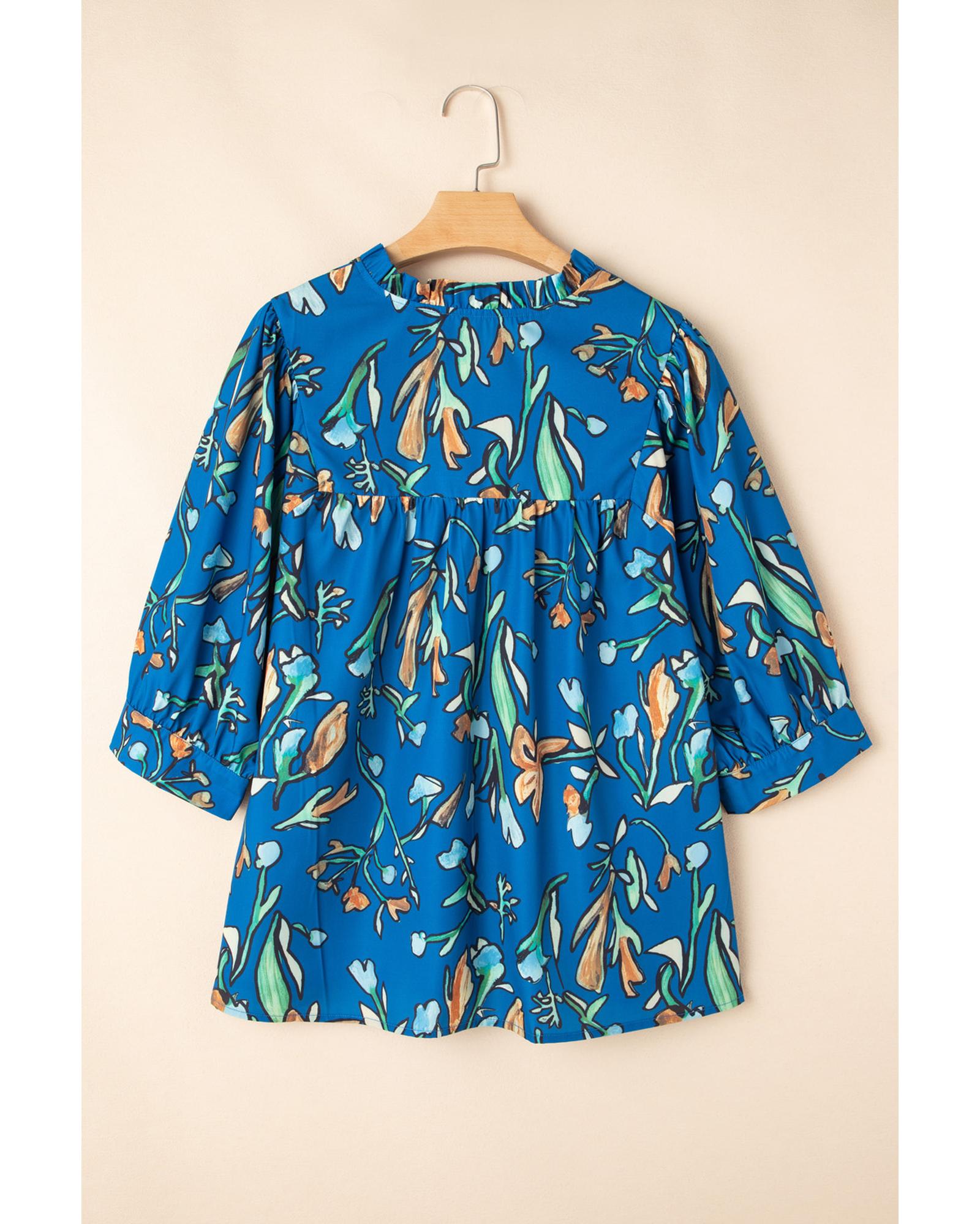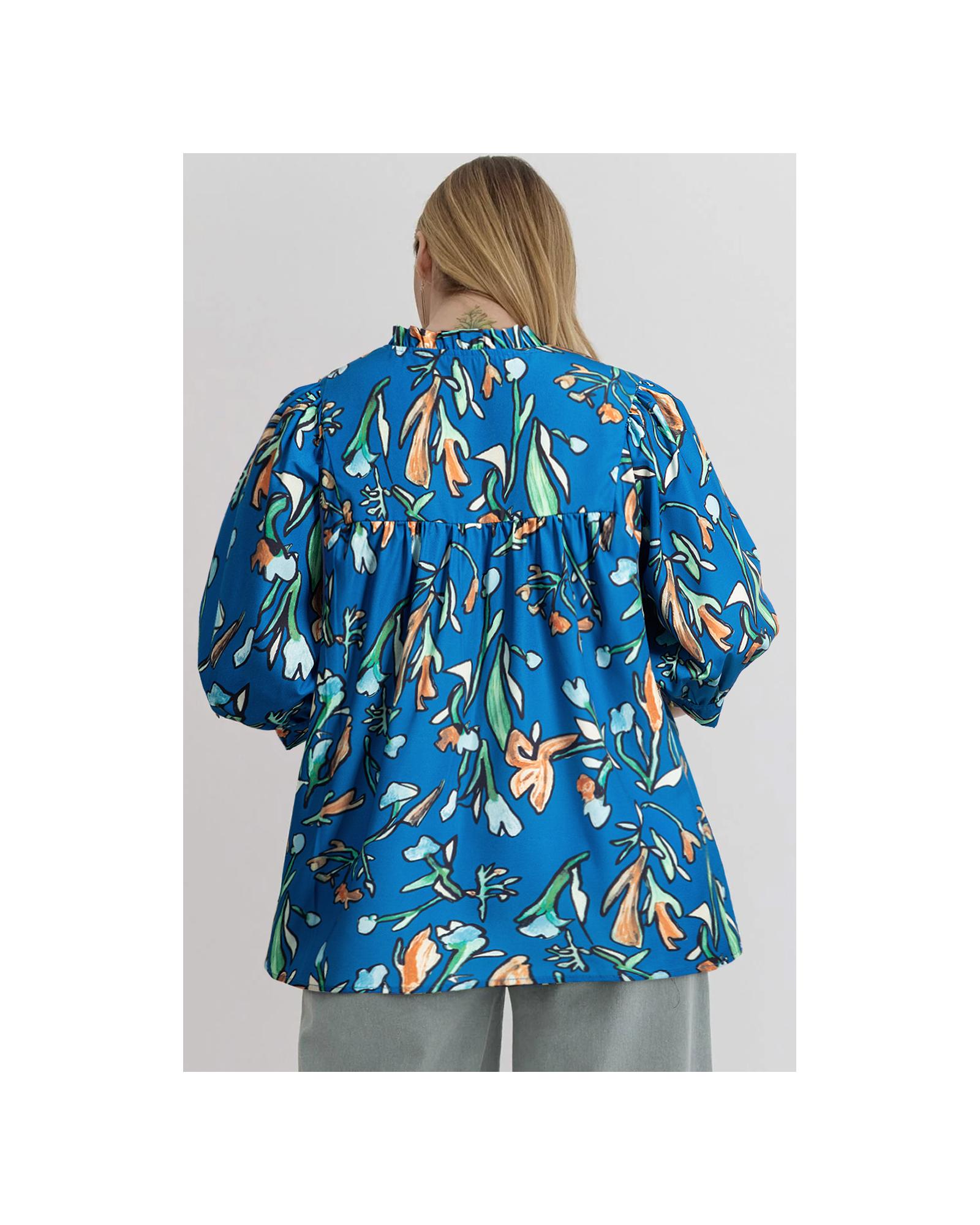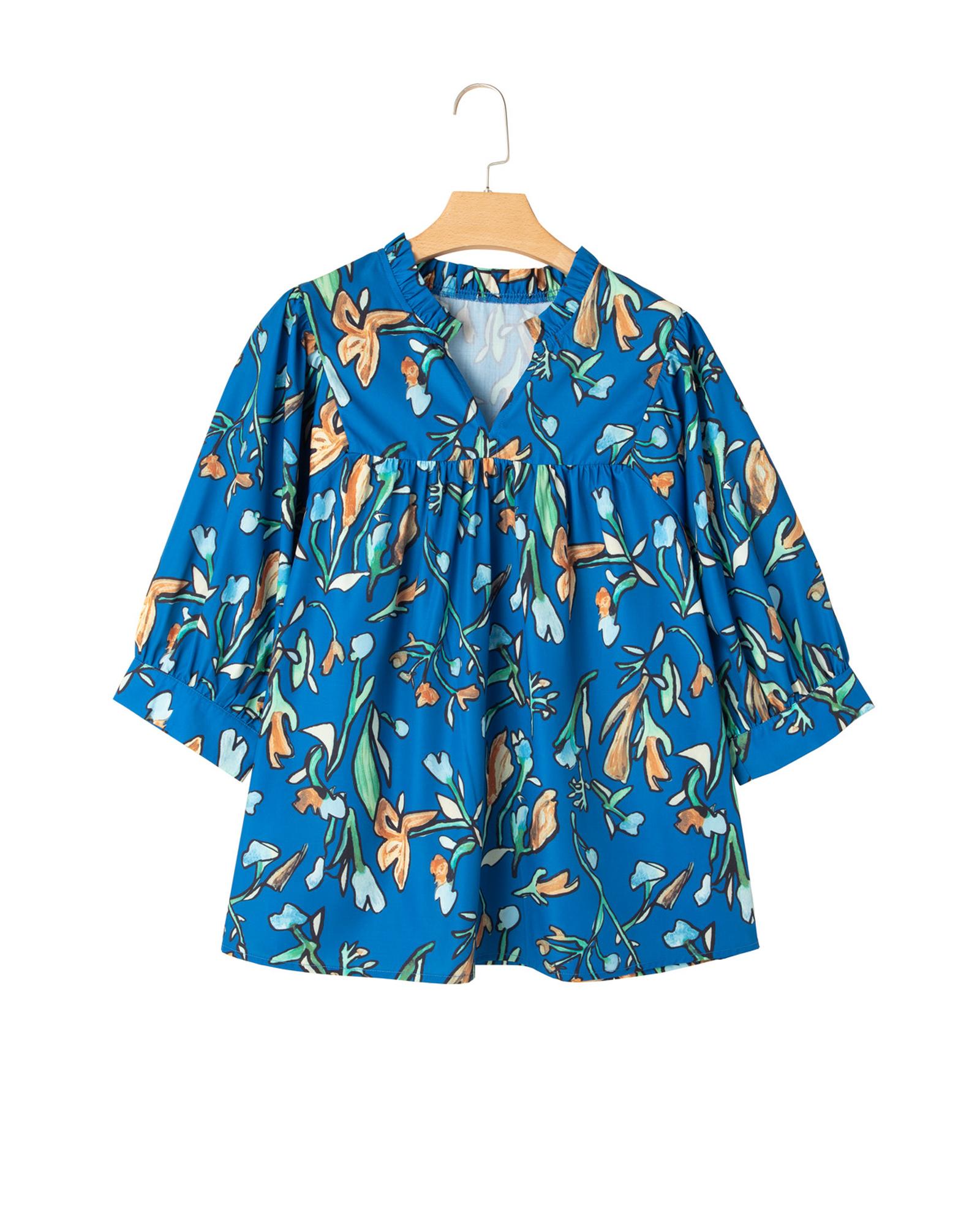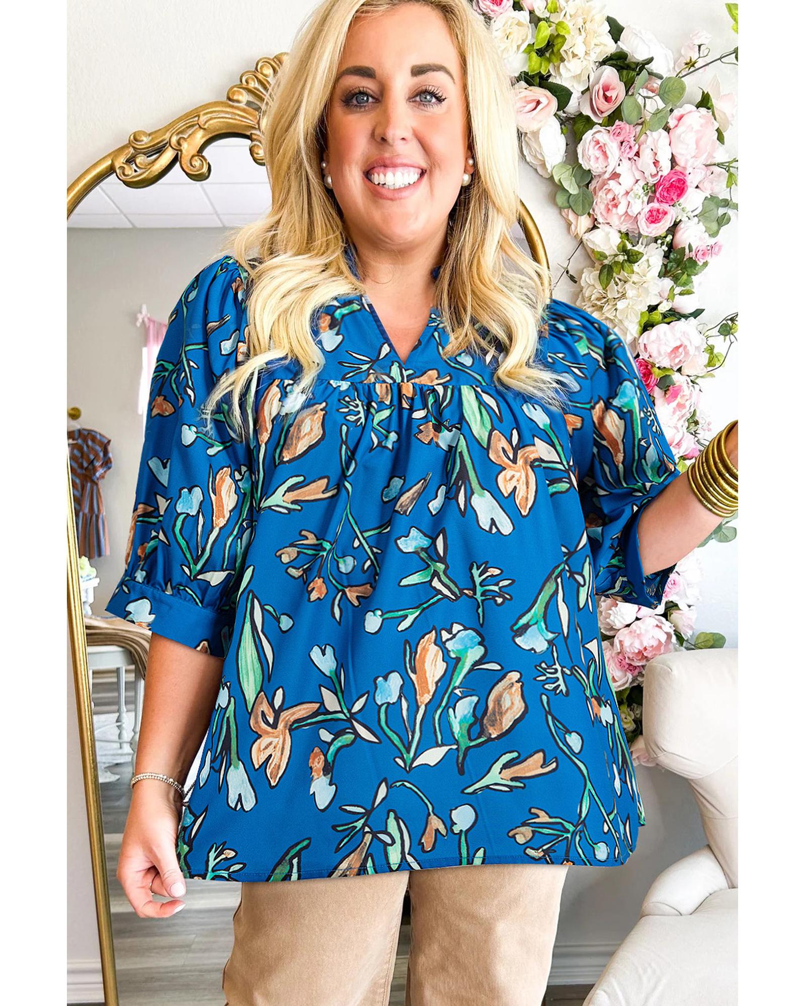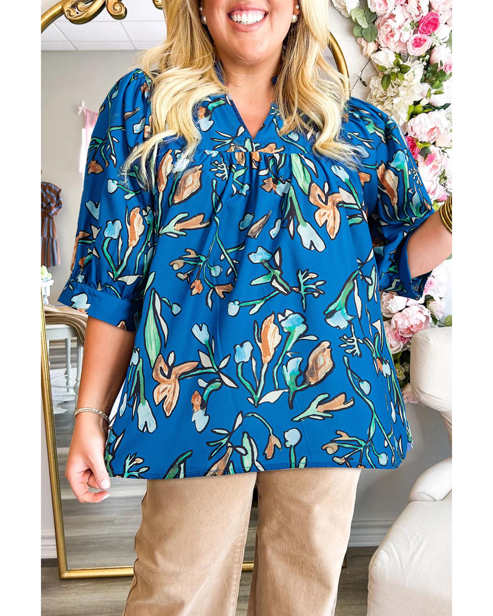 Blue Floral Notched V Neck Half Sleeve Plus Size Blouse – 2X