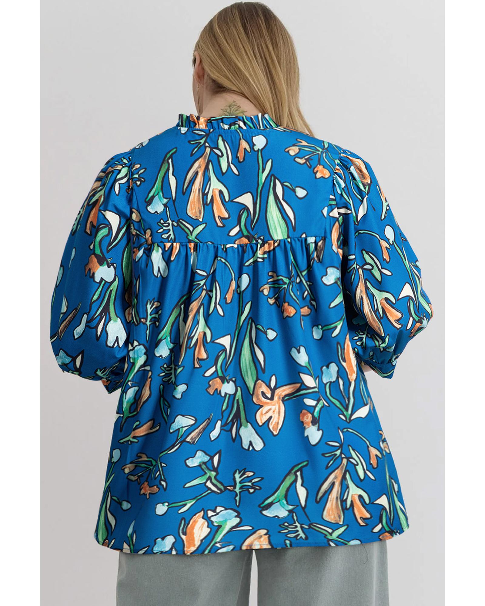 Blue Floral Notched V Neck Half Sleeve Plus Size Blouse – 3X