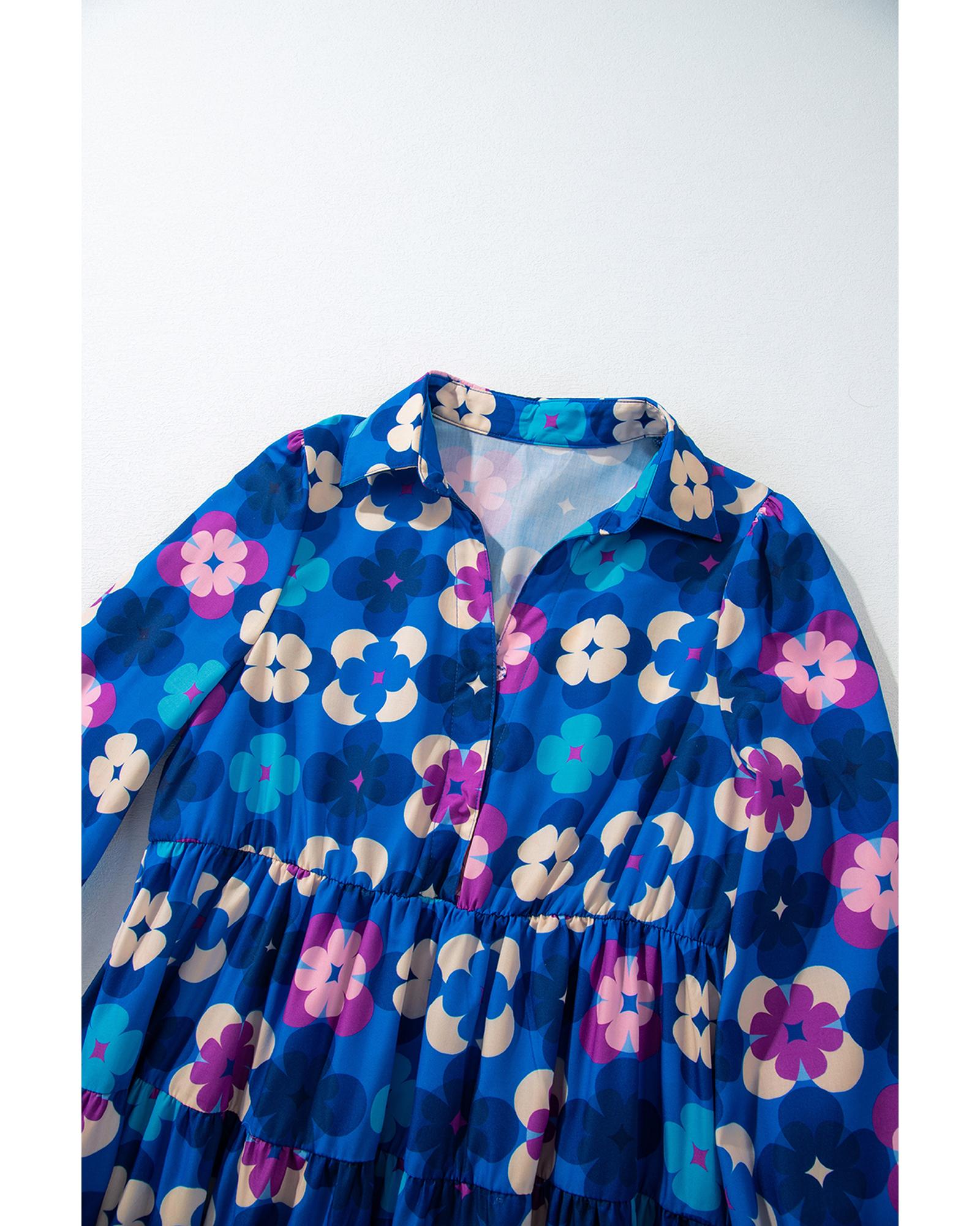 This blue floral midi dress features a romantic peasant sleeve design and tiered ruffles that add movement and elegance. The collared V-neck enhances its sophisticated look, making it suitable for garden parties, brunch outings, or casual gatherings.