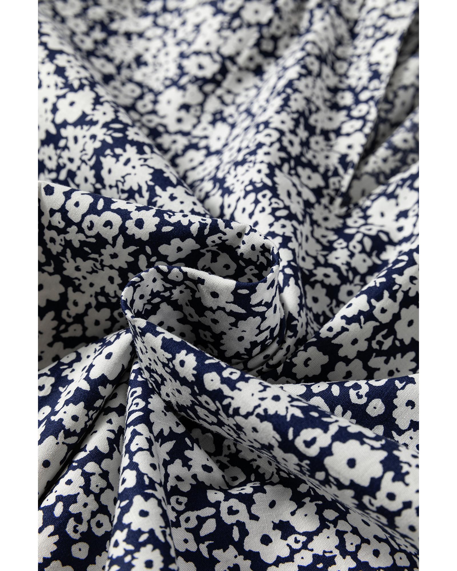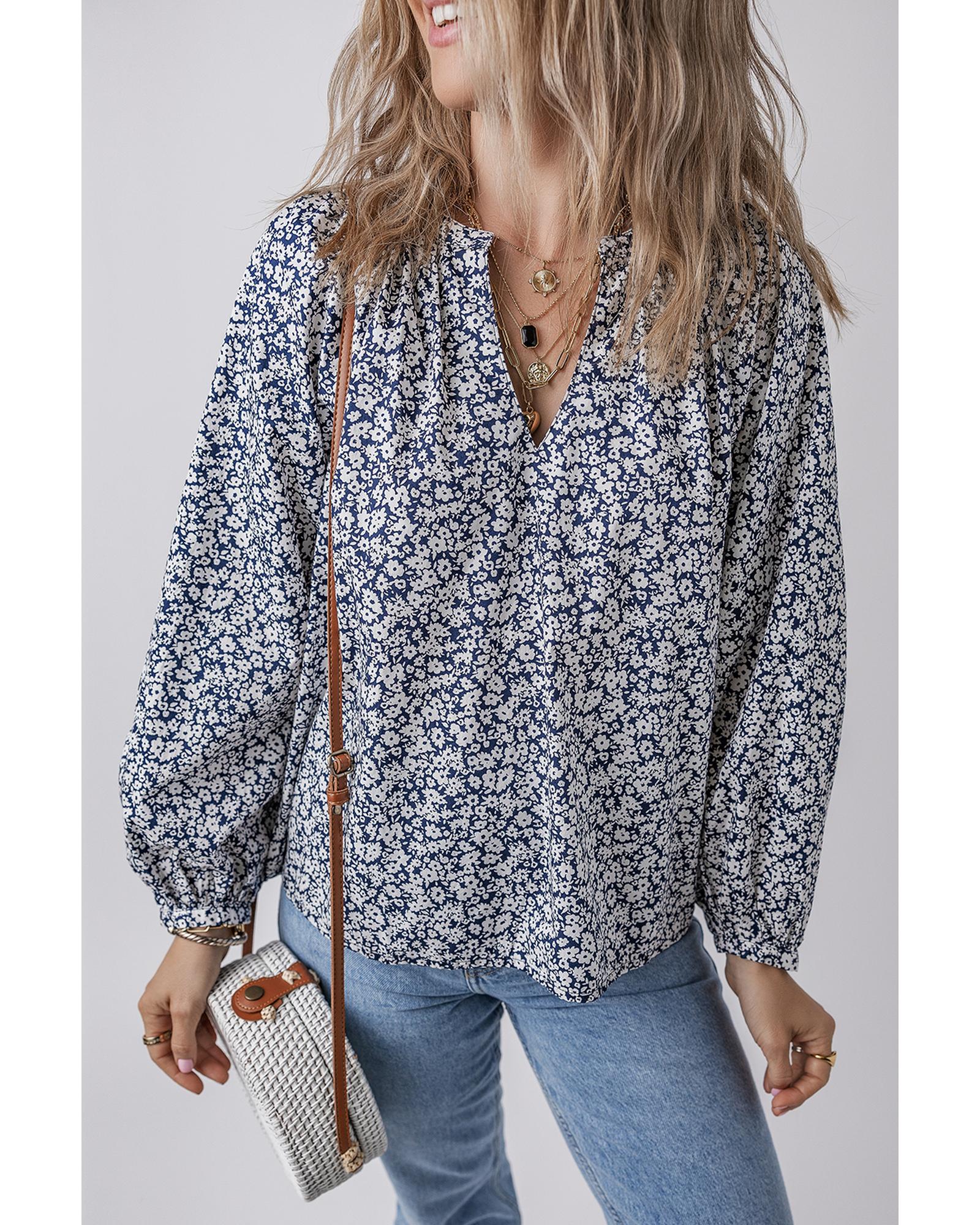 This blouse features a beautiful blue floral print and a stylish notched V neck design. With puff sleeves and a split neckline, it offers an elegant and graceful look suitable for various occasions.